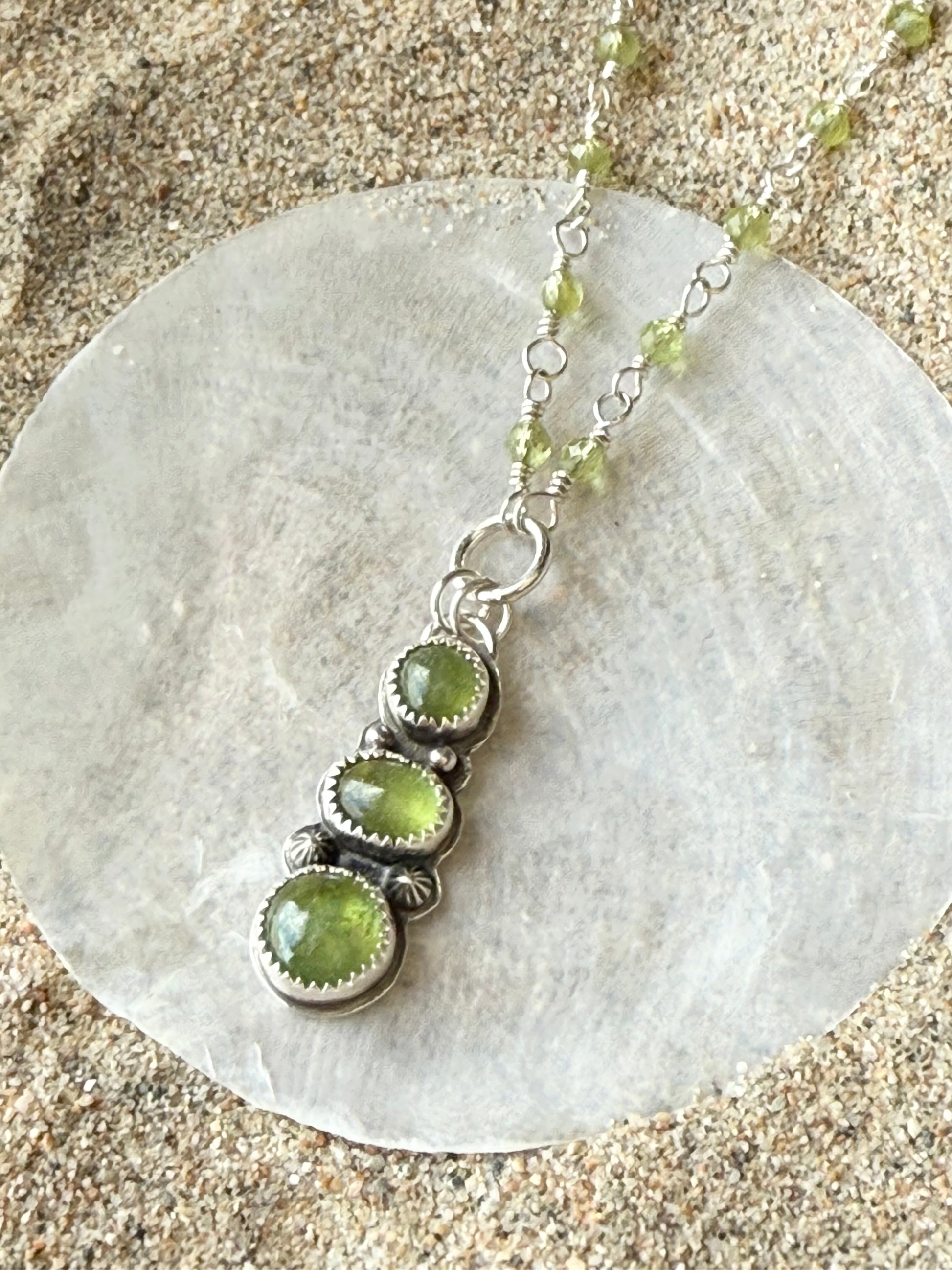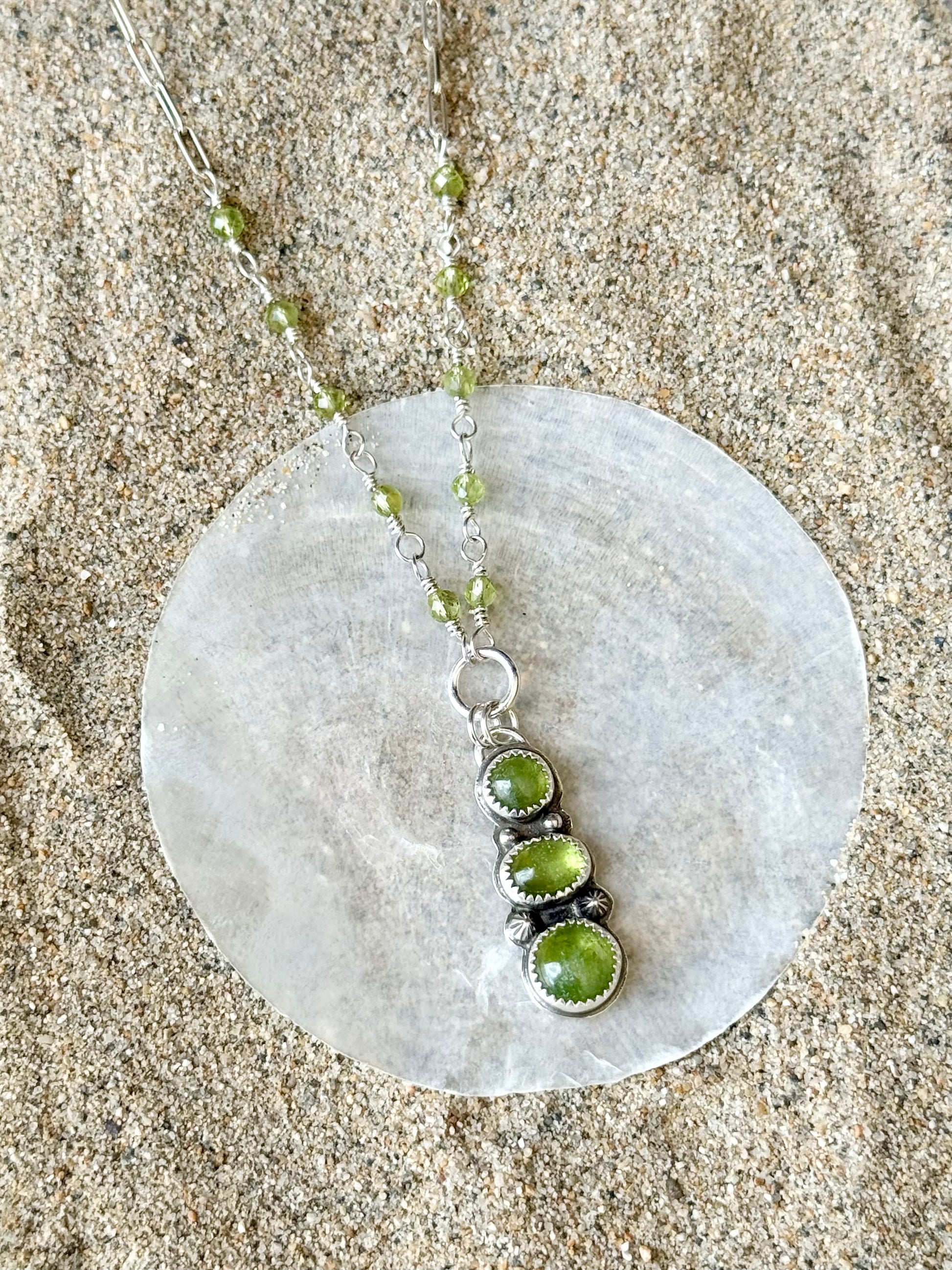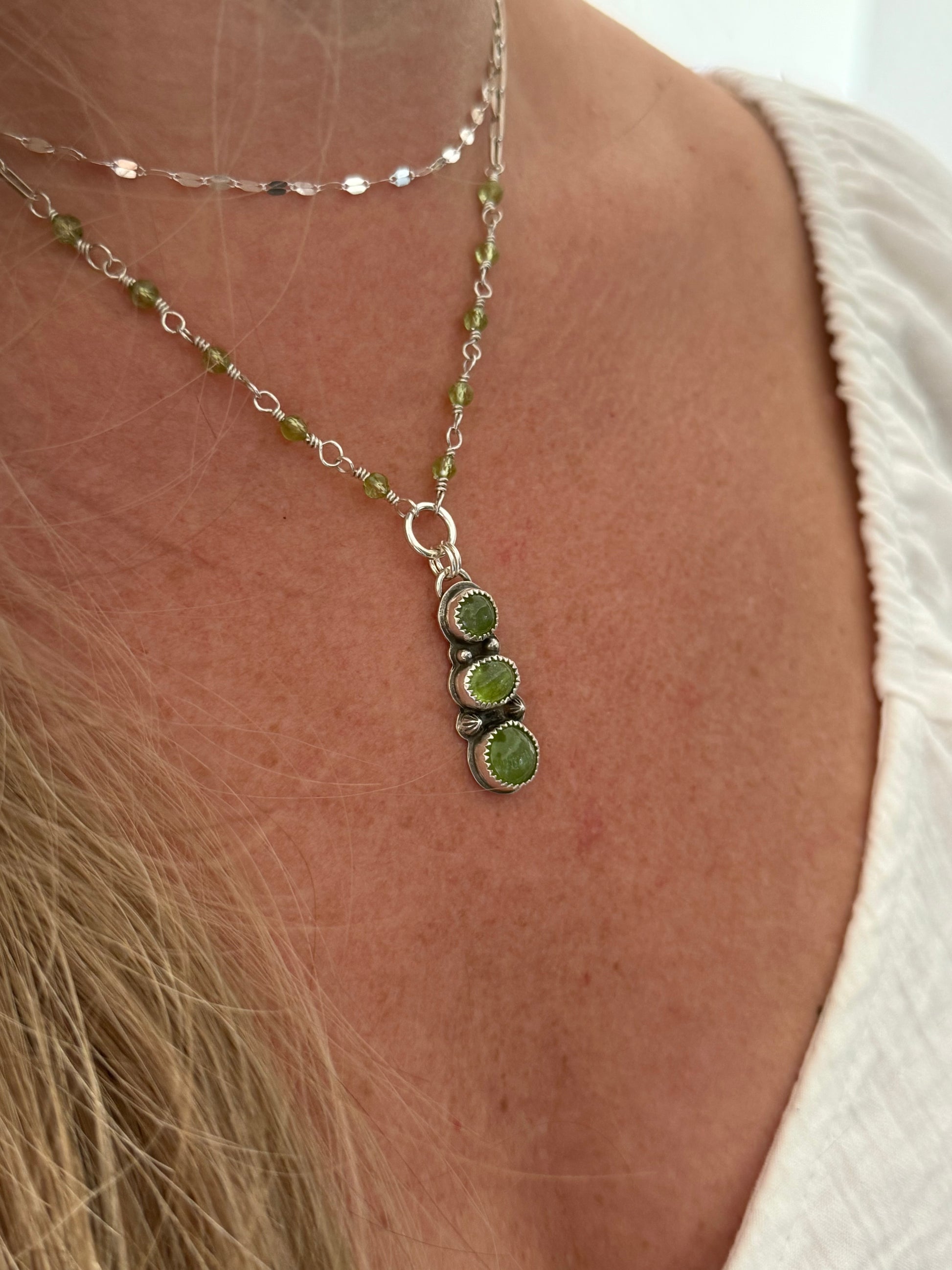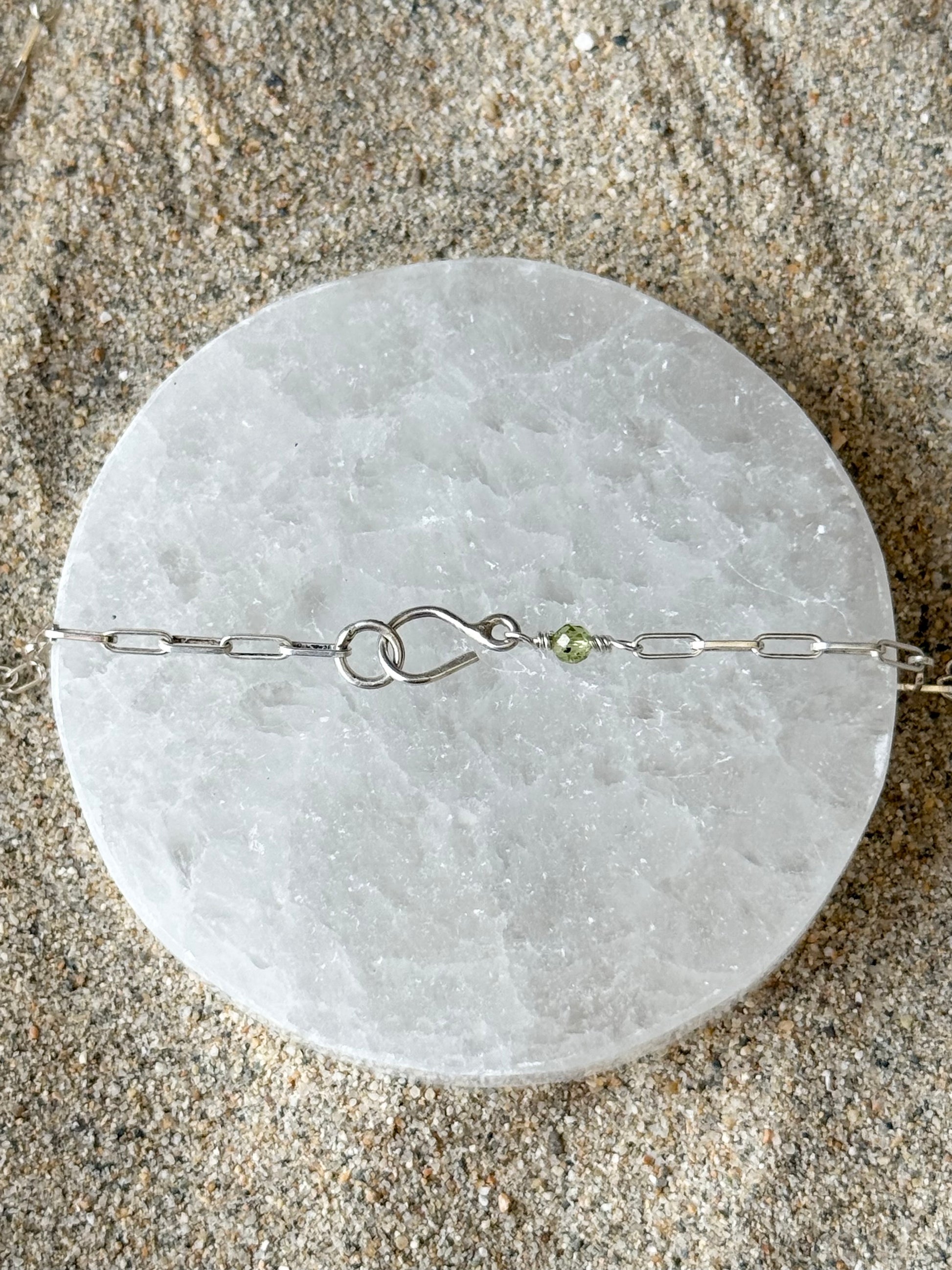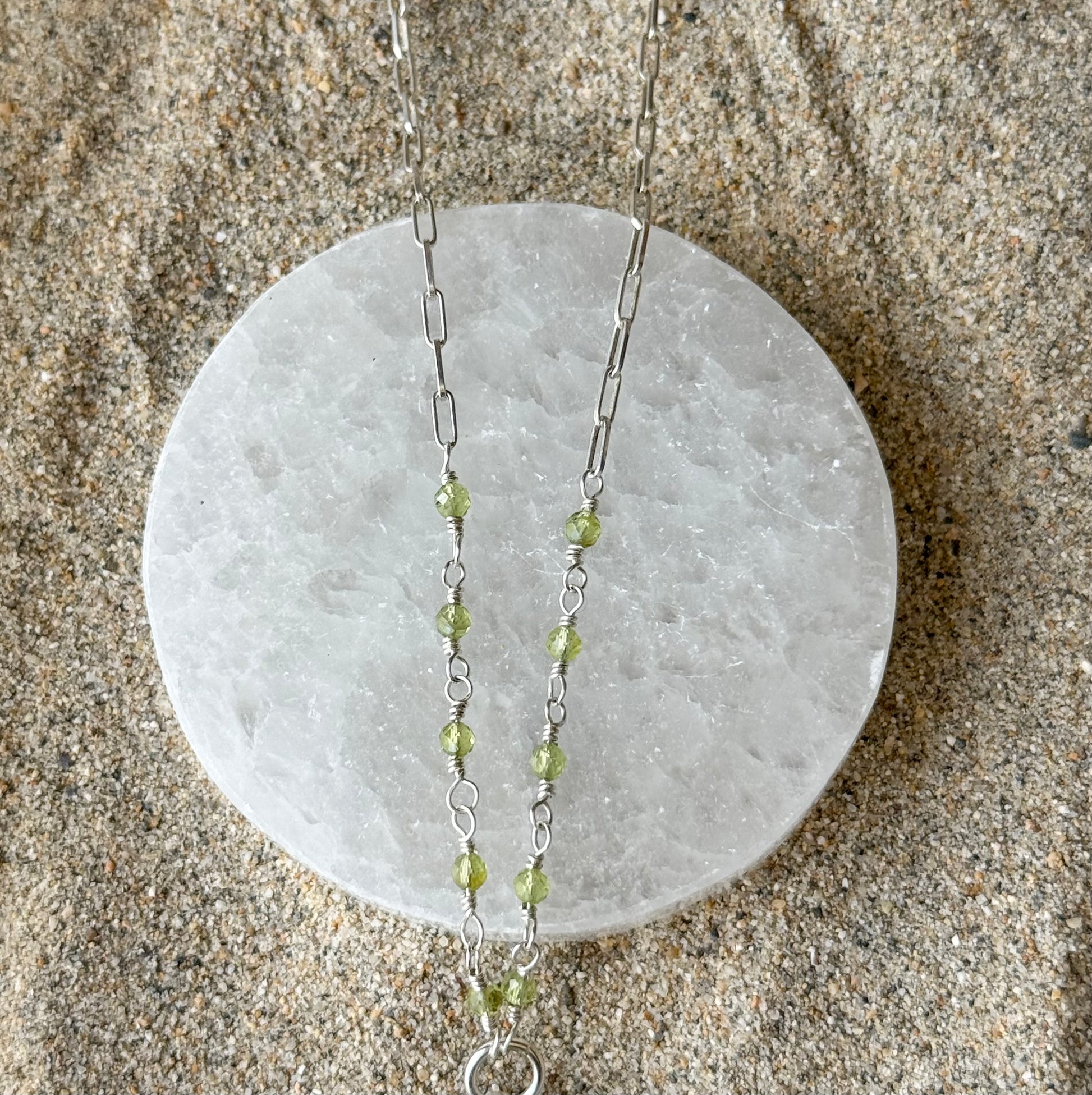 This peridot necklace is made with 3 peridot stones, and fine and sterling silver. The unique chain is handmade with delicate peridot beads and then attached to a sterling silver paperclip chain. The clasp is handmade as well. It measures approximately 18” long and looks great paired up with a shorter chain!