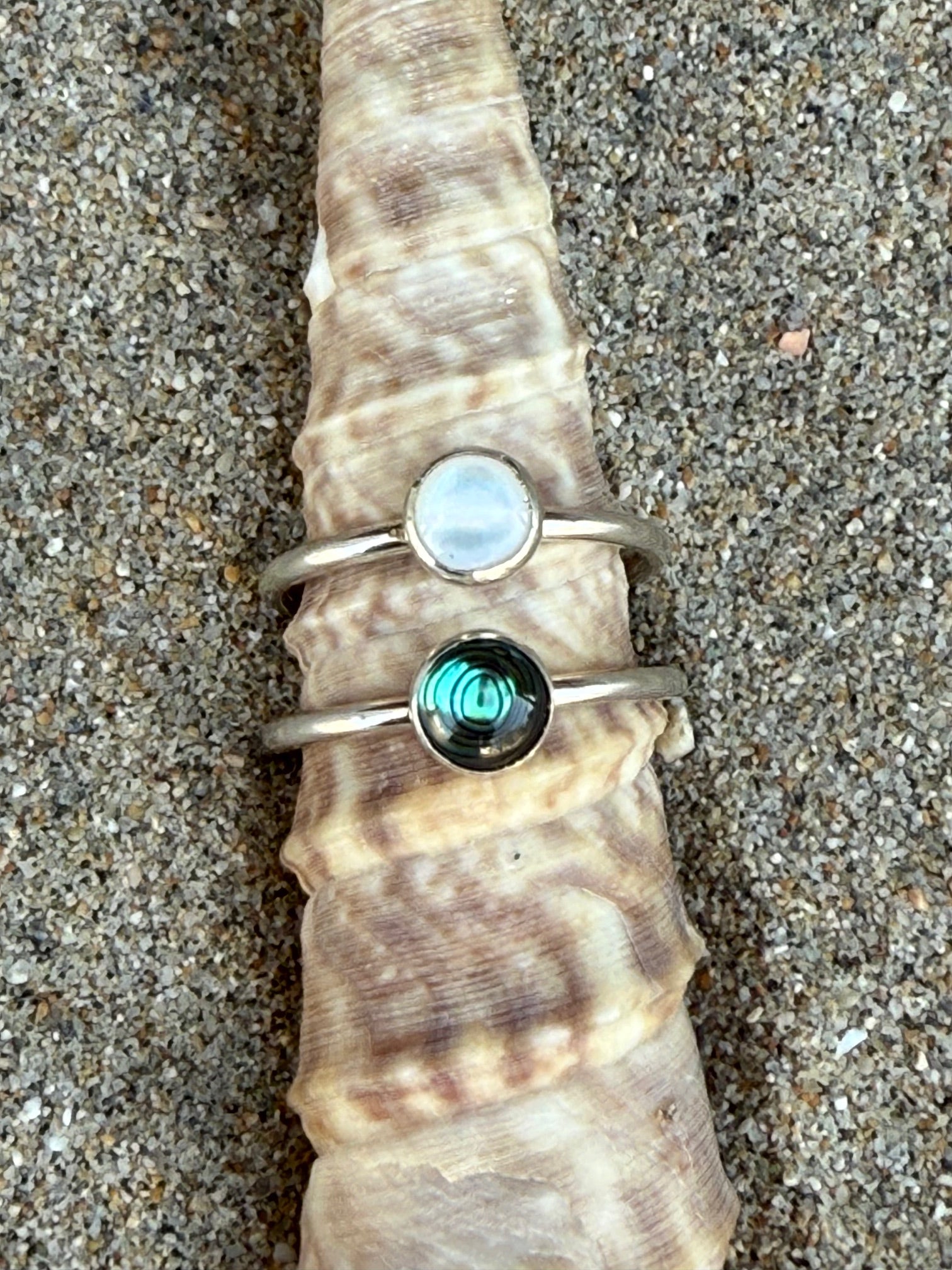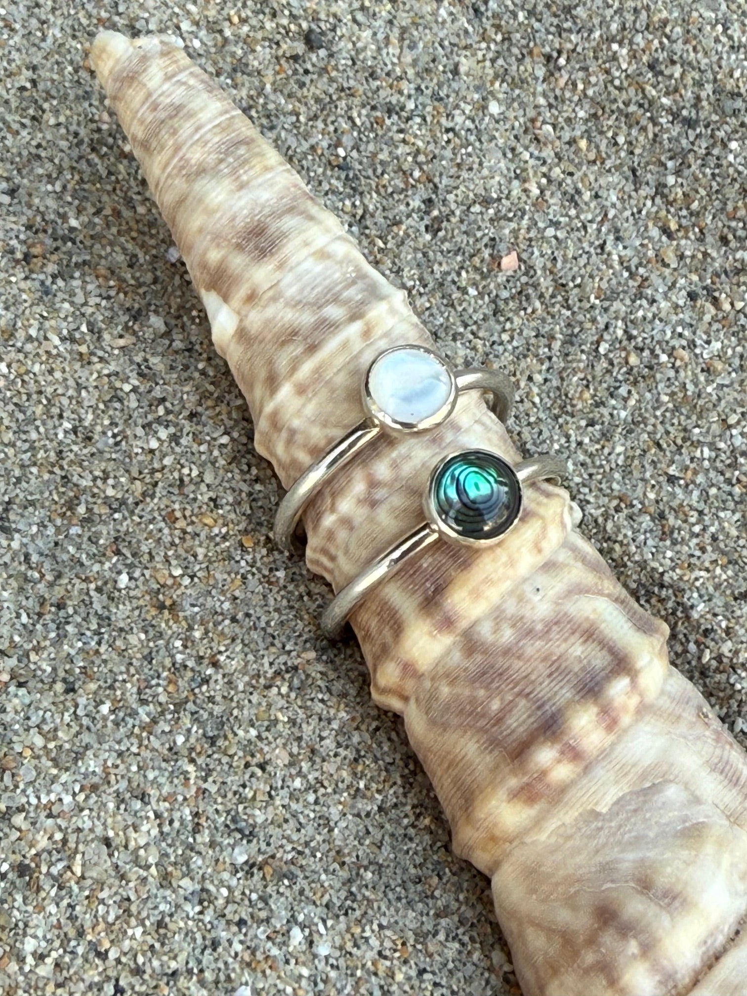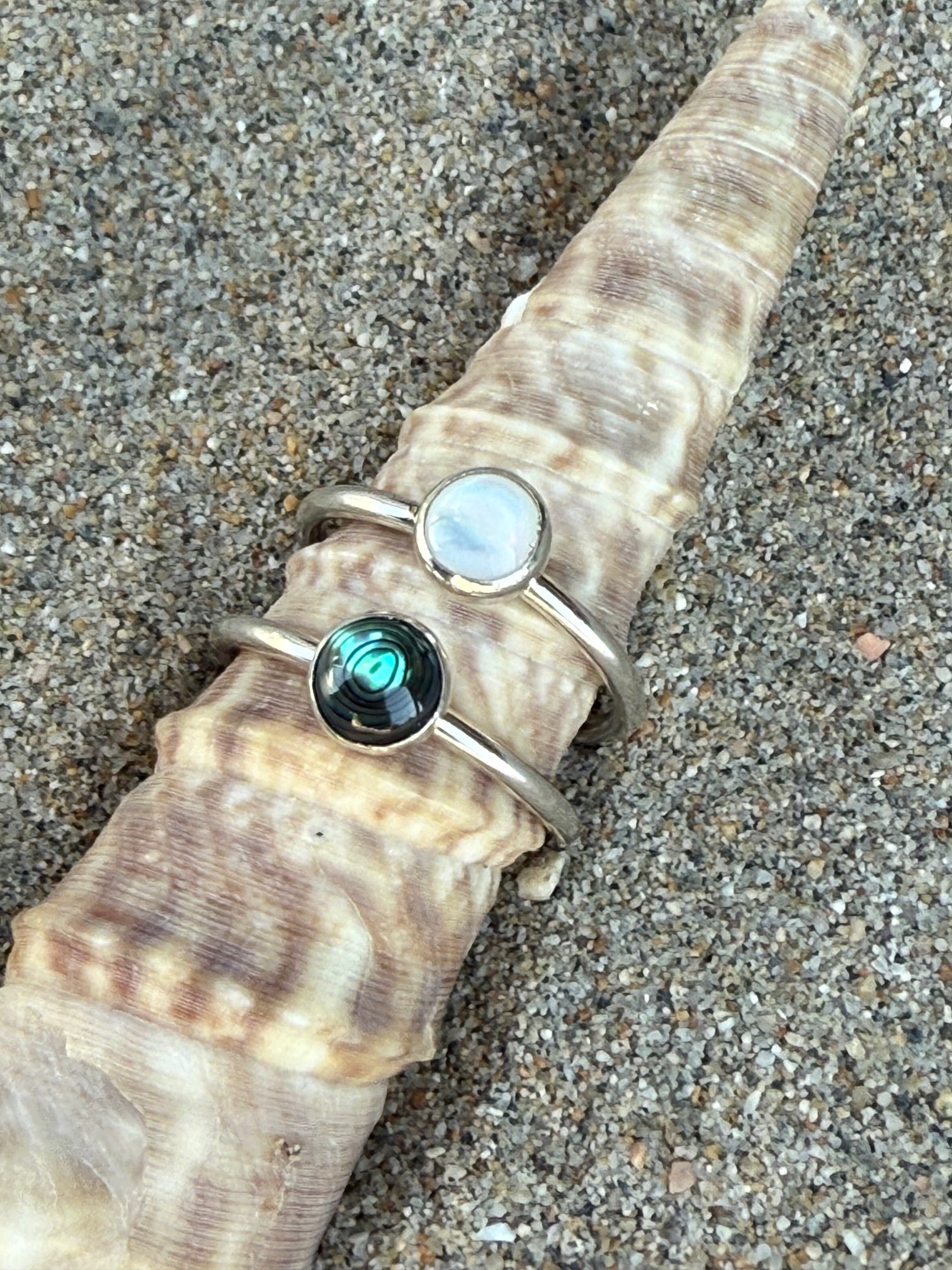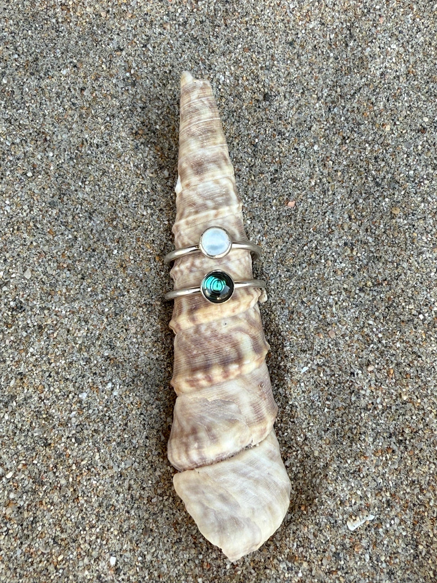 These 6mm abalone or mother of pearl is set in a sterling silver bezel cup and the ring band is also sterling silver. Select your ring size at checkout.