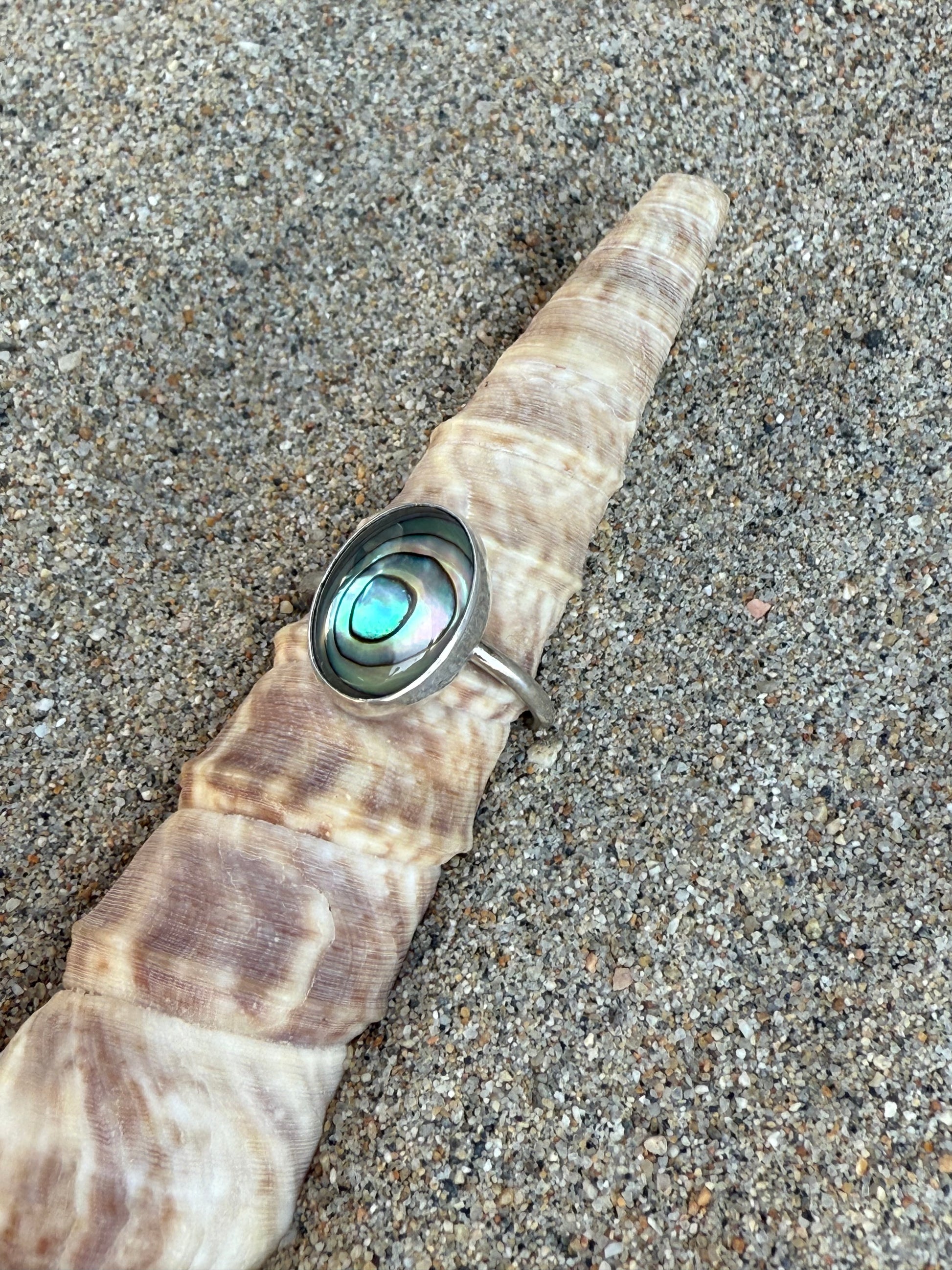 The oval abalone shell is set in sterling silver and the ring band is also sterling silver. The ring is a size 6.5 and cannot be resized. I do have a few more cabochons similar if you'd like a ring made in your size - just send me a message!