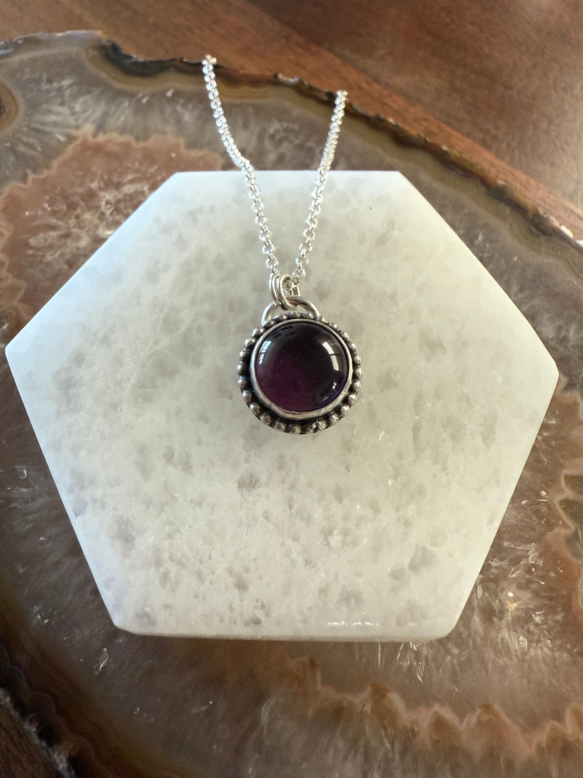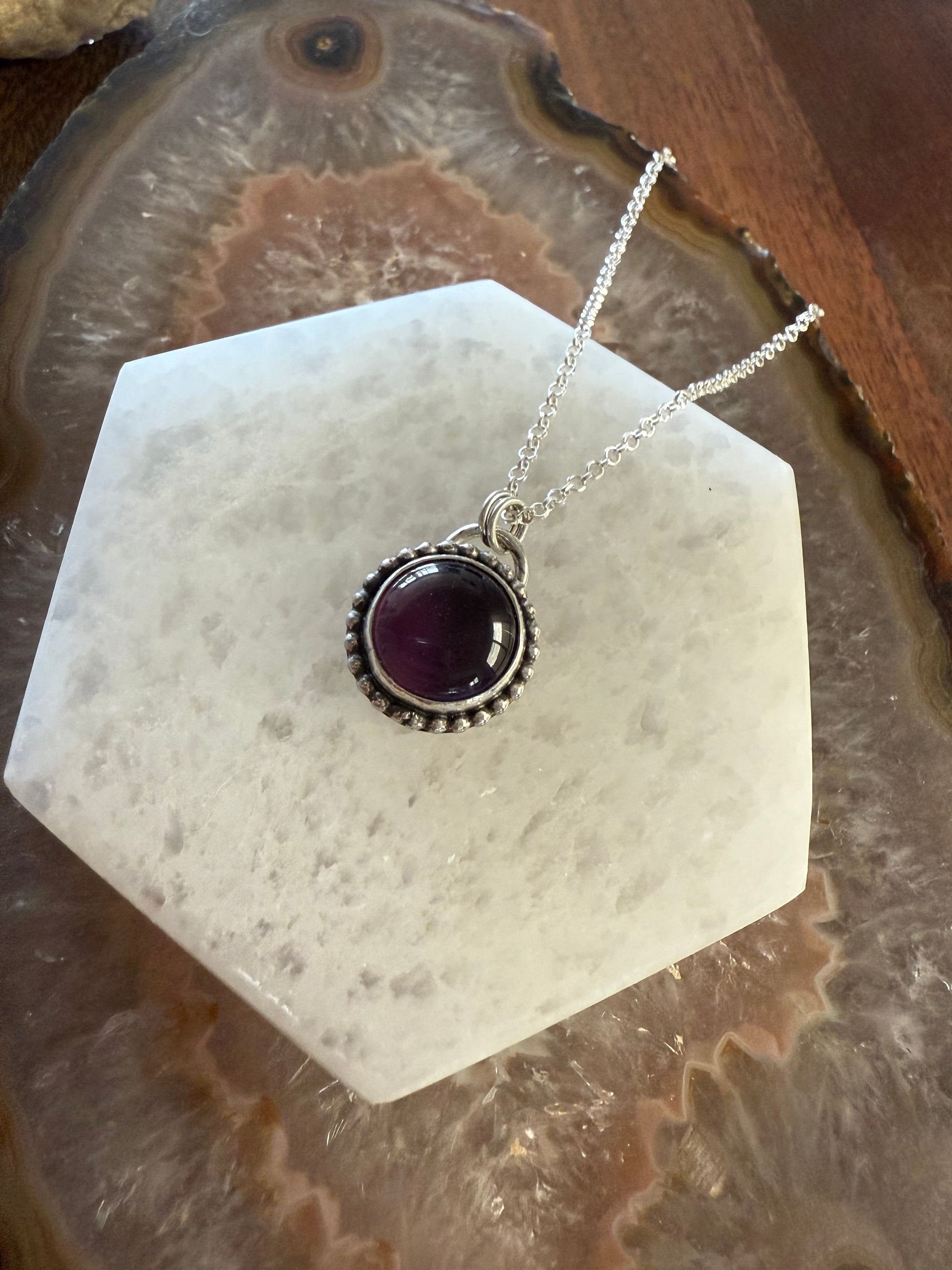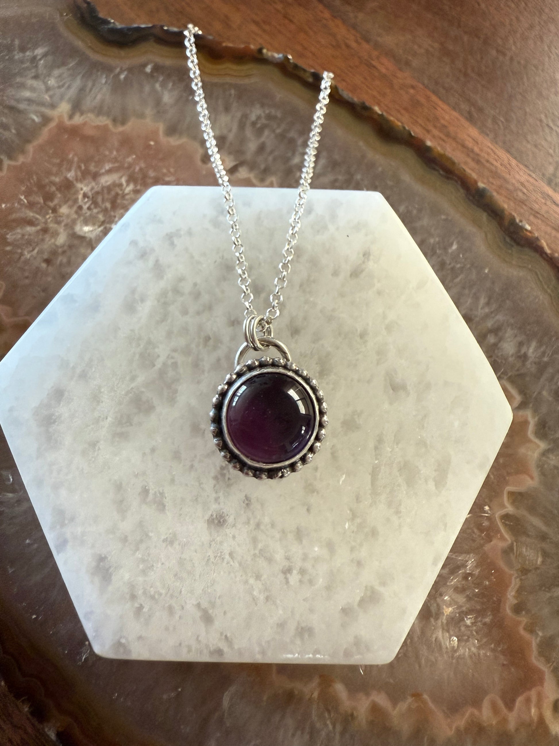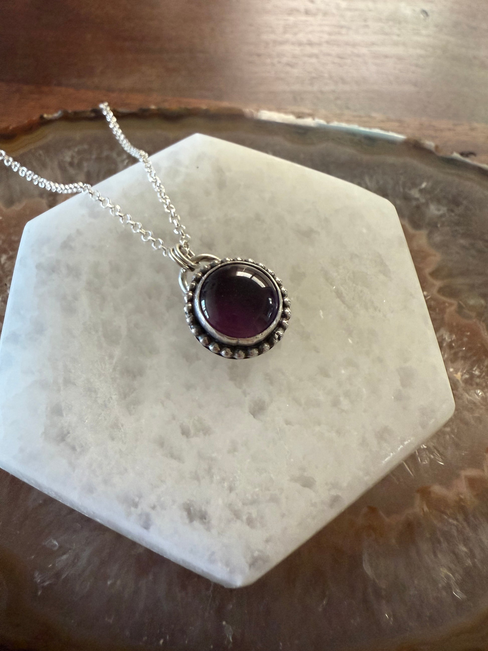 This amethyst necklace is made with fine and 925 sterling silver. The circle is wrapped with a sterling silver bead wire. You will receive the pendant only. Chains can be purchased on a separate listing. *rolo chain is pictured*