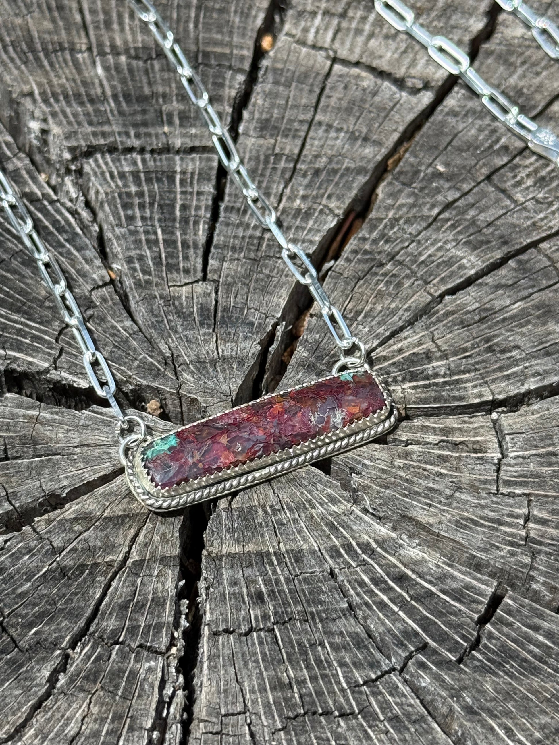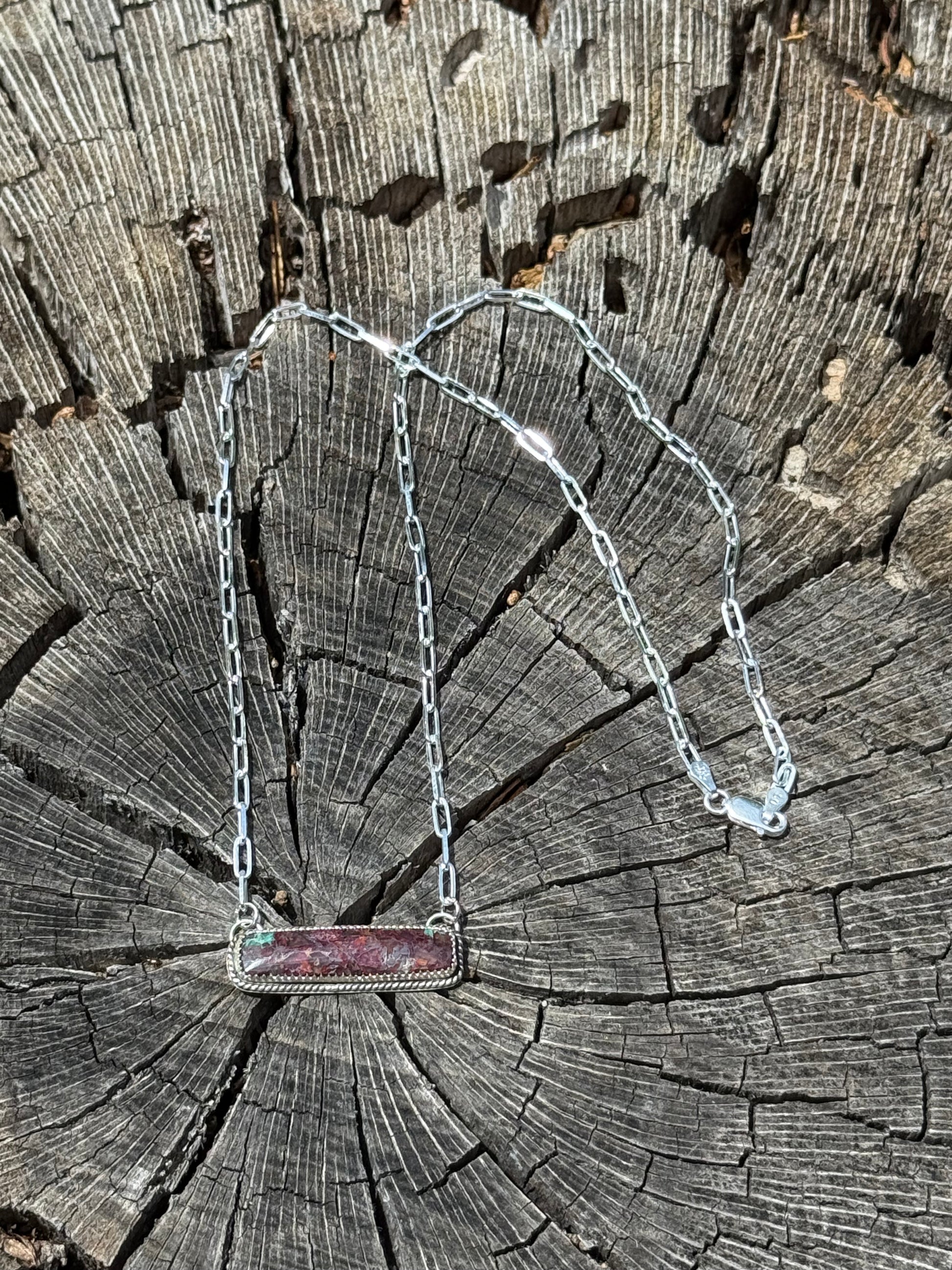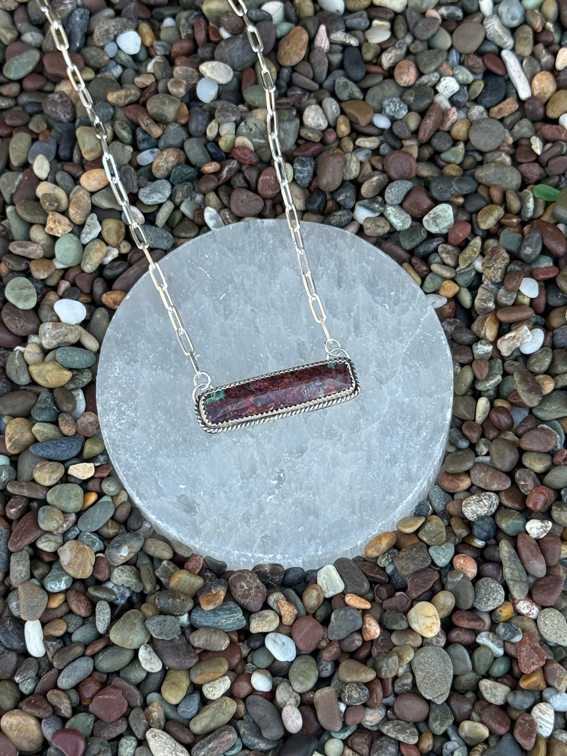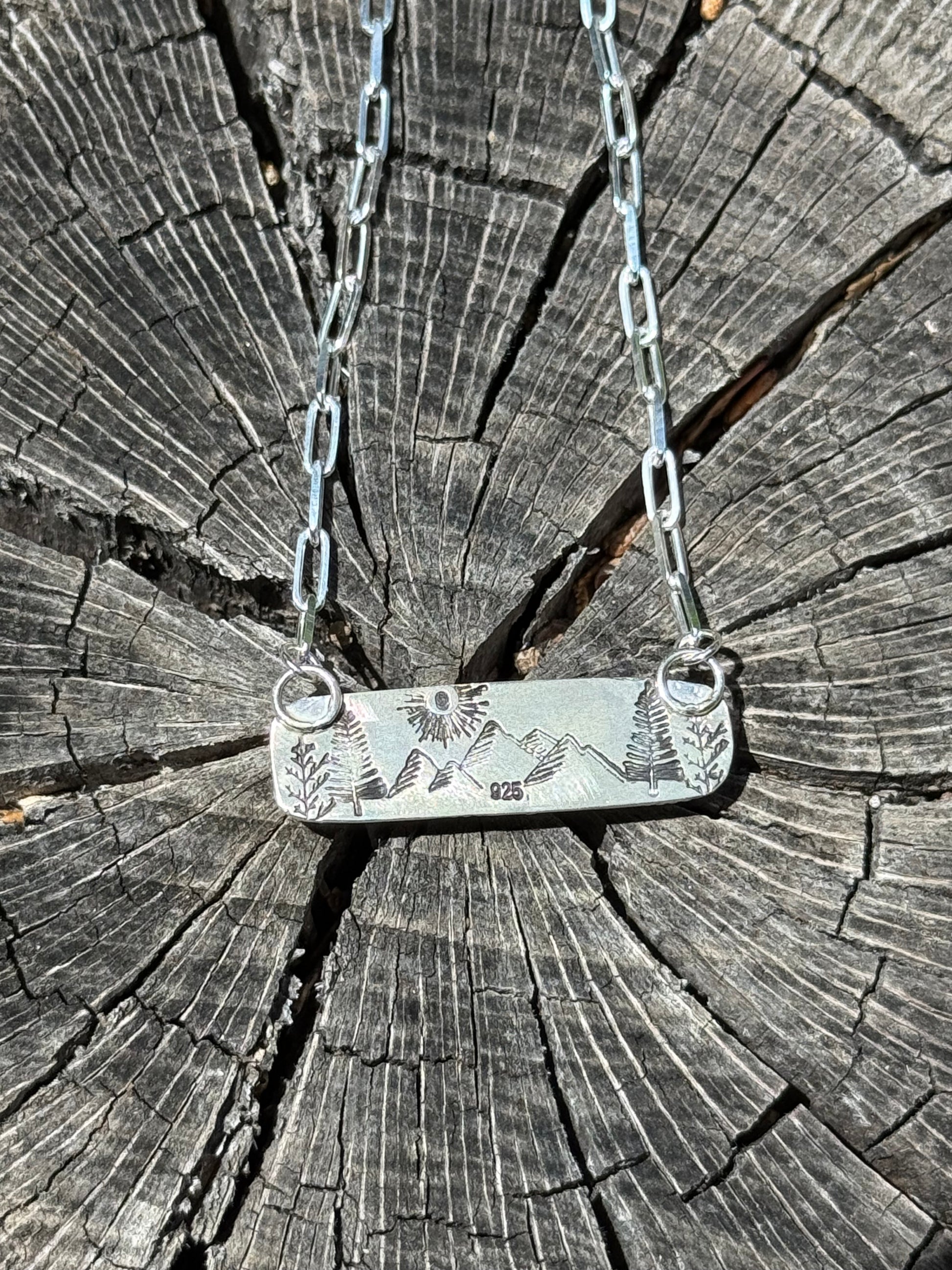 This copper chrysocolla necklace is made with fine and sterling silver. The added twist wire is also made of sterling silver. The chain is a sterling silver paperclip chain. Stamped on the back is a mountain scene. It measures approximately 19”.