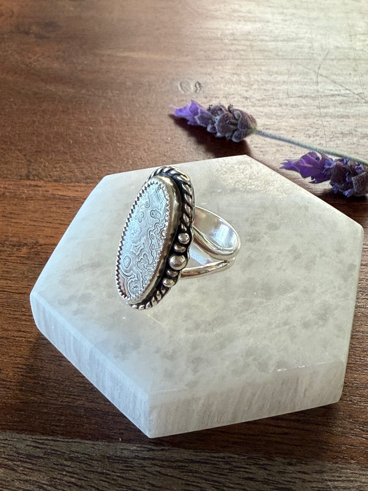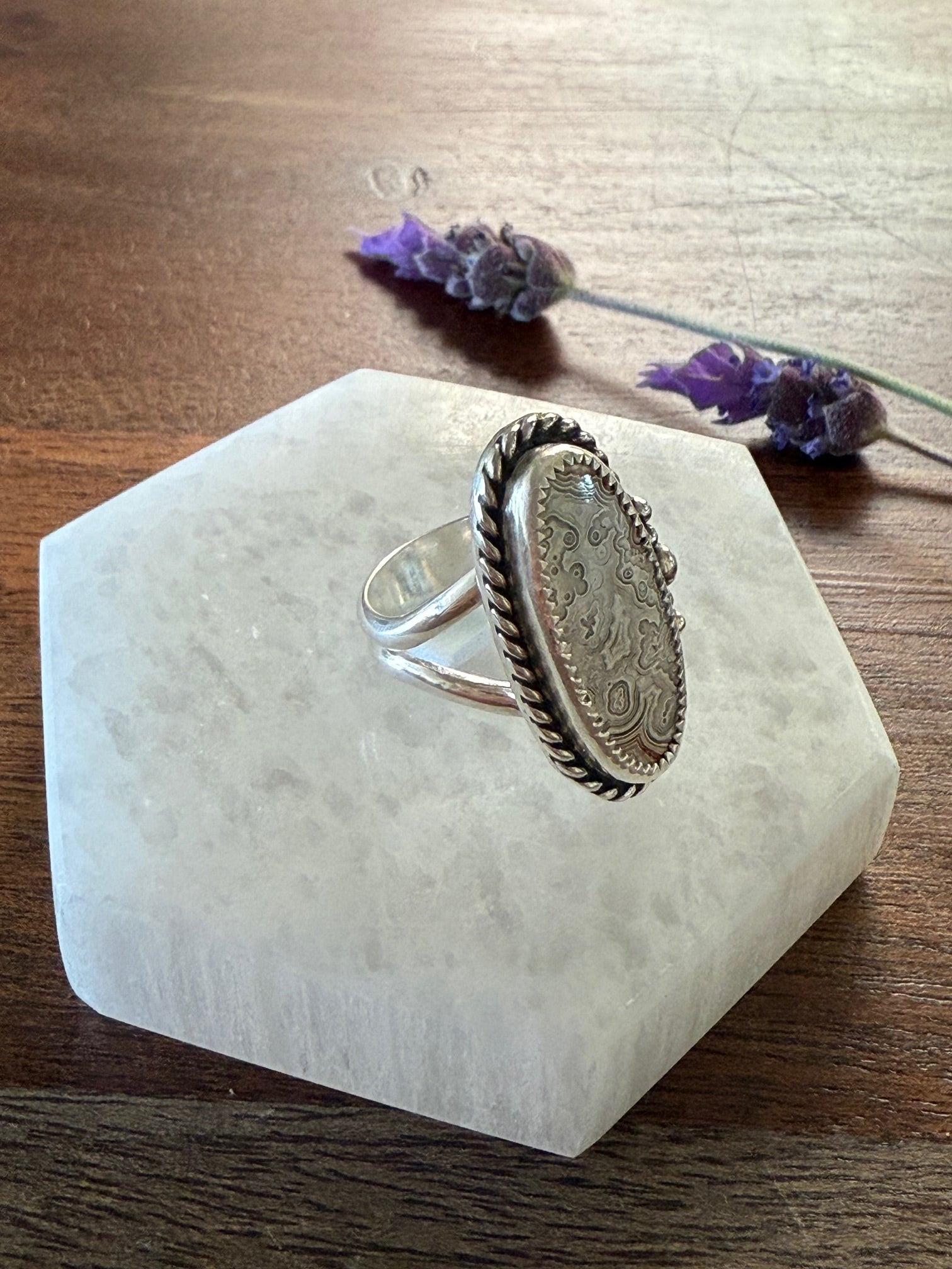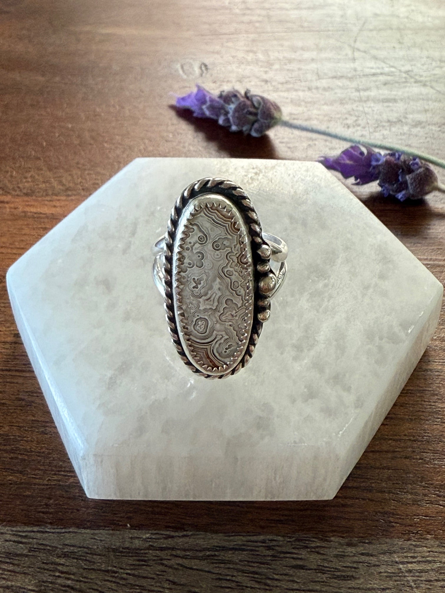 The crazy lace agate stone is set in a fine silver bezel, wrapped in a delicate rope wire with some ball embellishments to add an extra special touch. The ring band is sterling silver and is a size 8 and cannot be resized. I do have a few more cabochons similar if you'd like a ring made in your size - just send me a message!