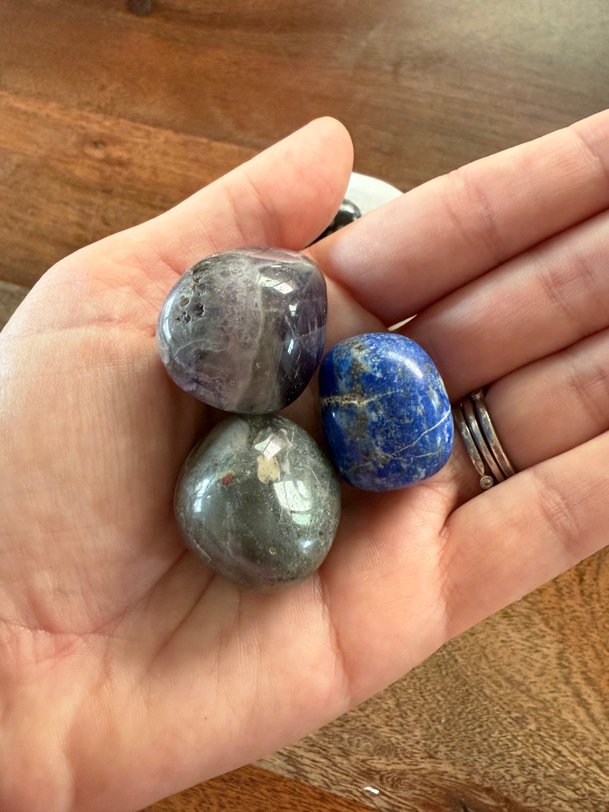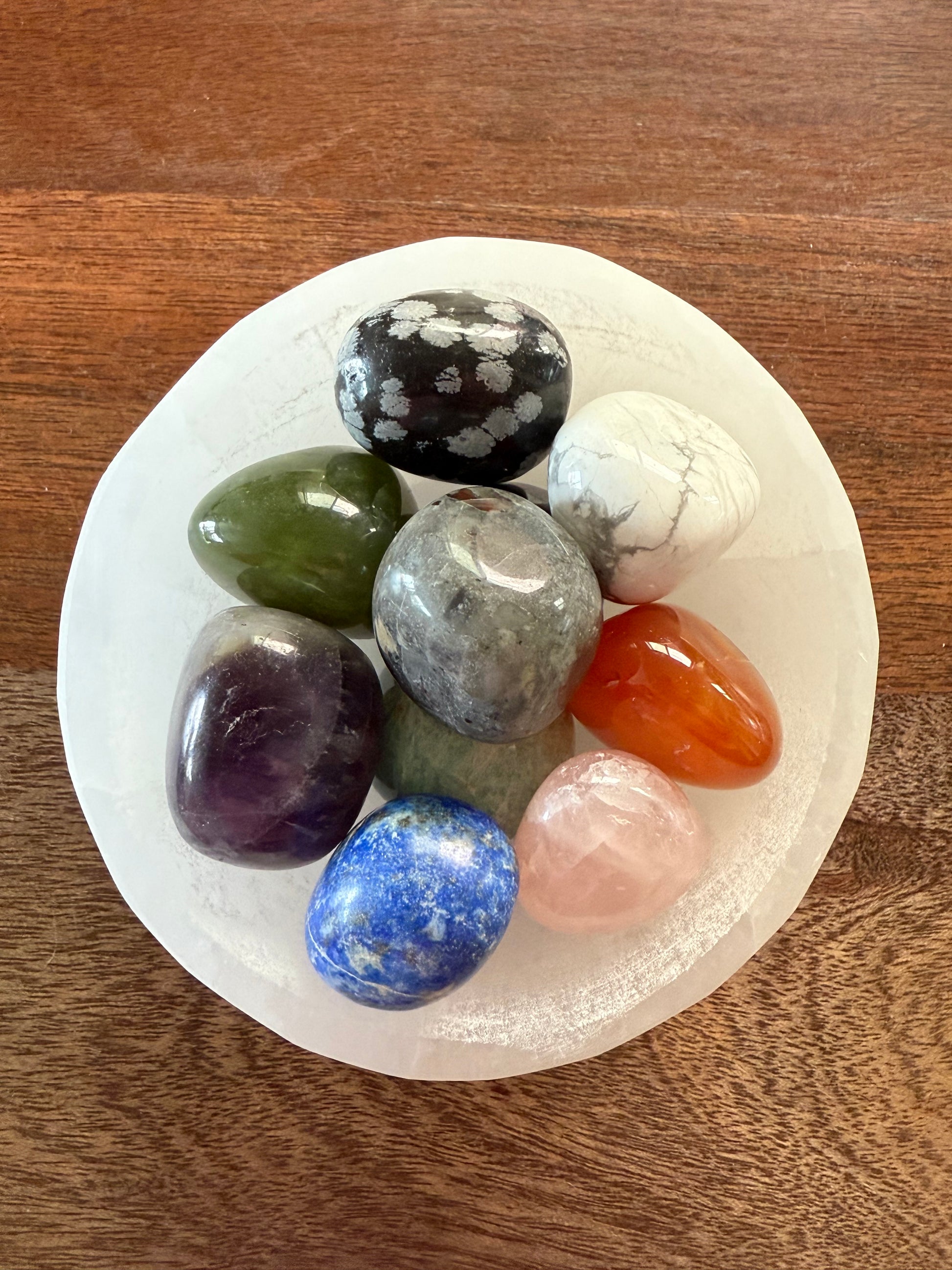 Each tumble measures between .50” - 1.00”. The selenite dish measures approximately 3.75” wide and 1.5” tall.