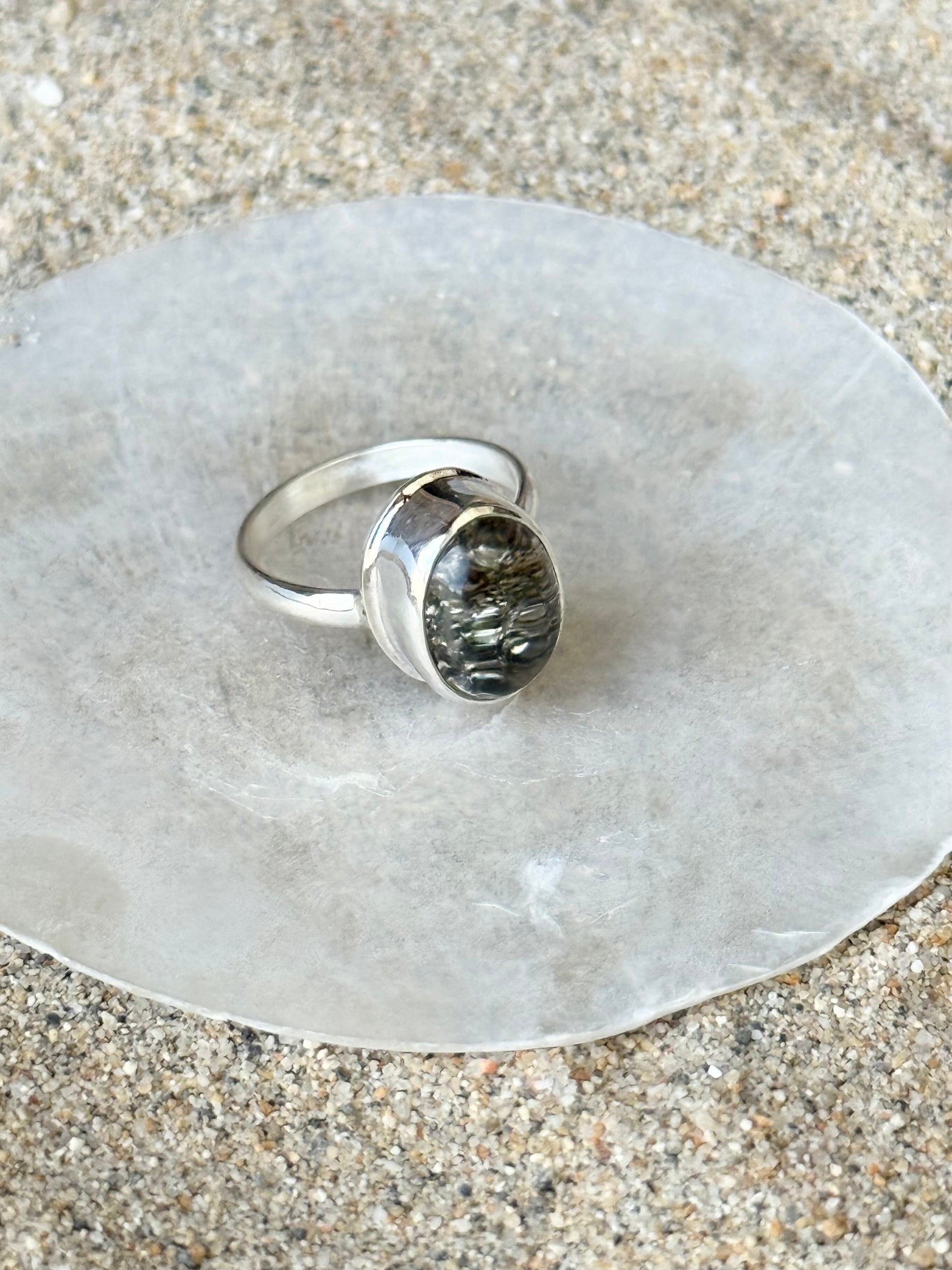 The garden quartz is set around fine silver, the band is sterling silver. This ring is a size 5.5 and cannot be resized. You will receive the exact ring as pictured.