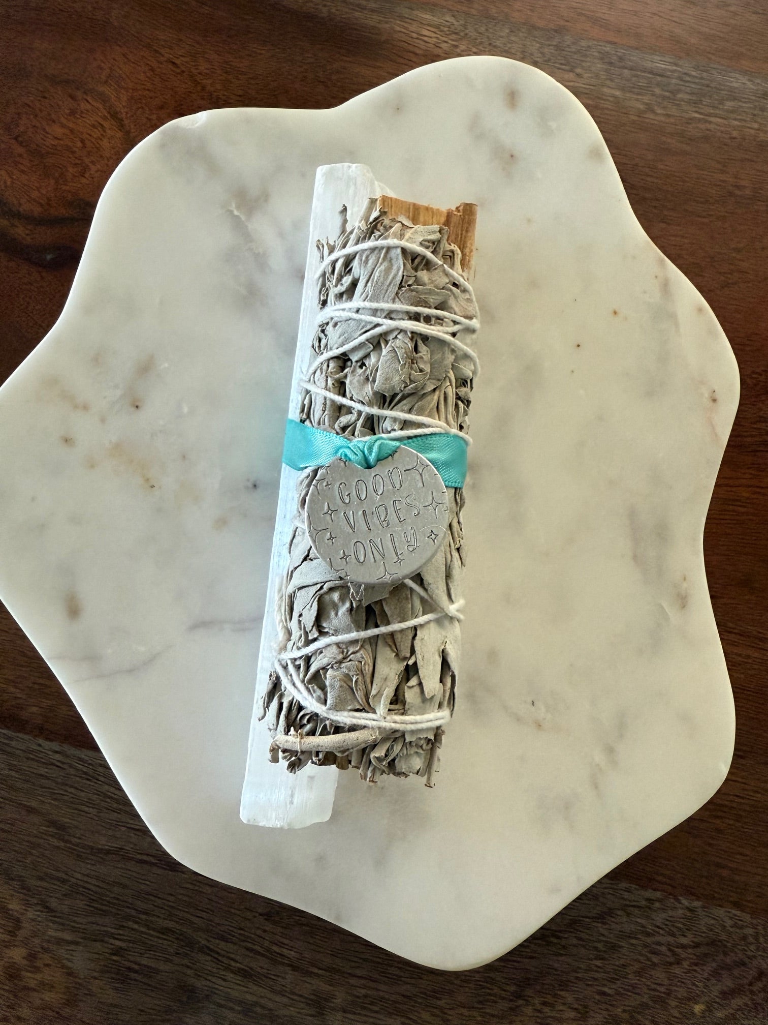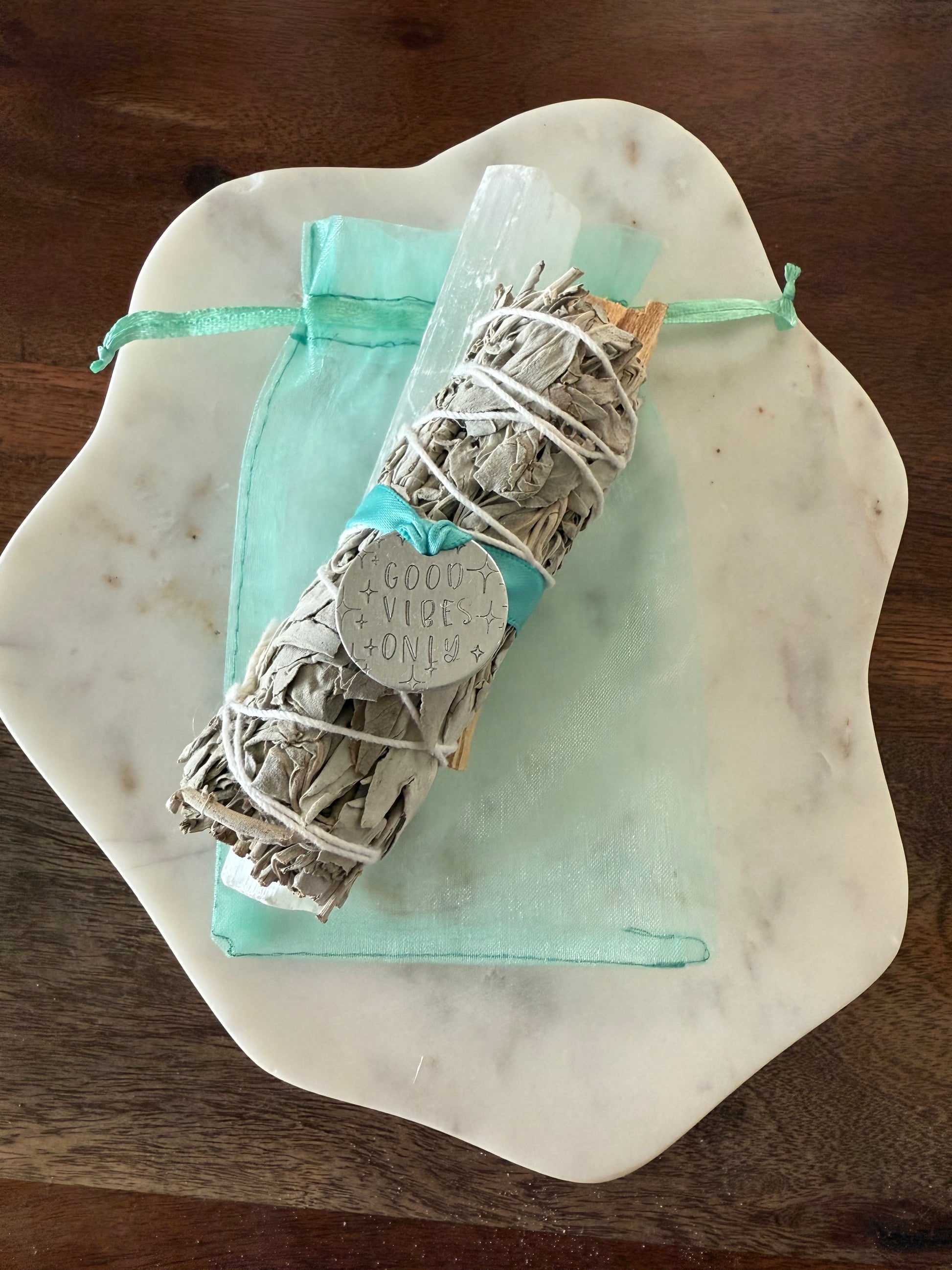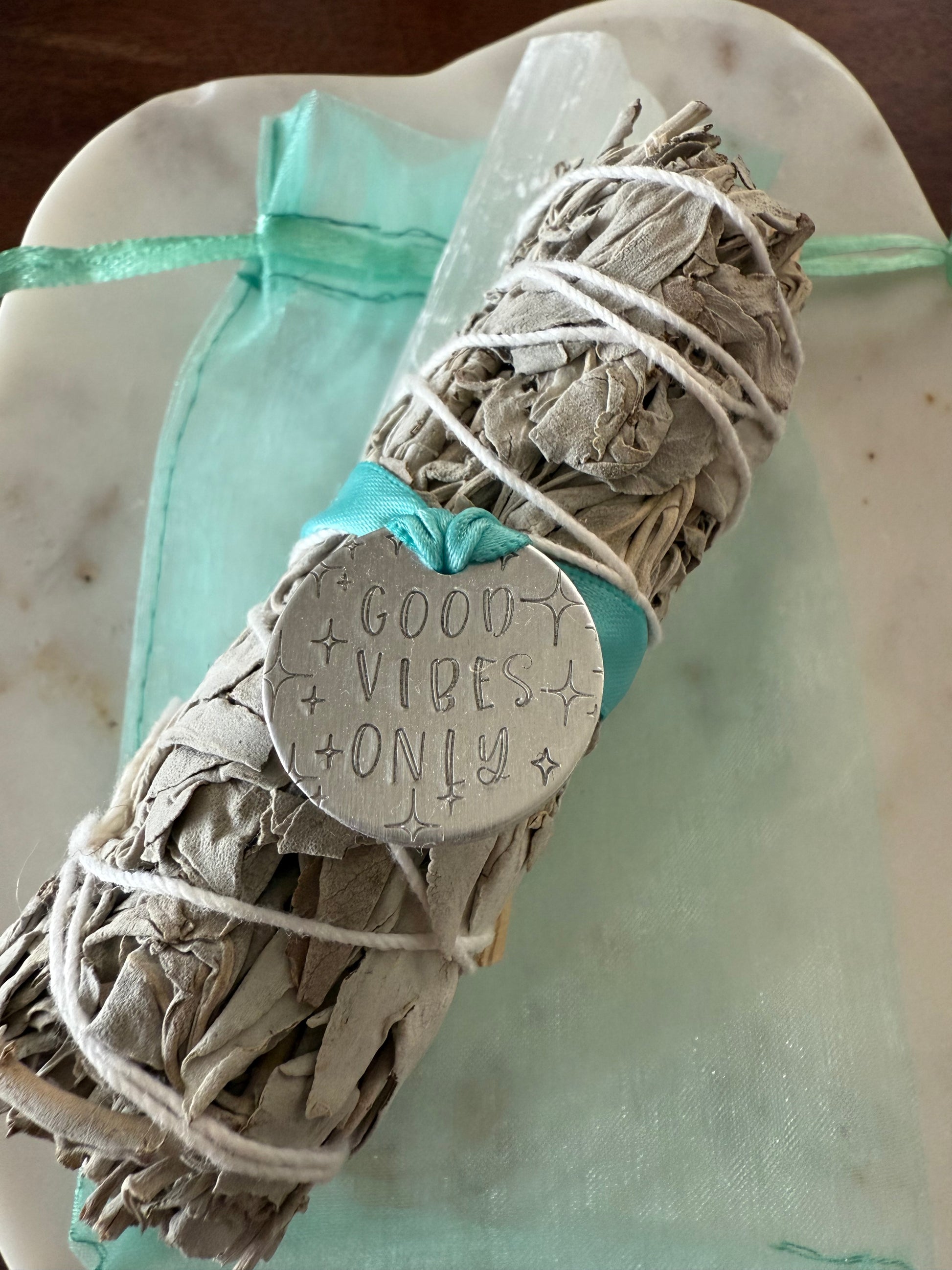 Clear the energy and raise the vibe with this magical cleansing bundle! Featuring a powerful trio: a selenite wand, palo santo stick, and a sage bundle. They are all tied together with a reusable hand-stamped “Good Vibes Only” tag to keep the intention strong.