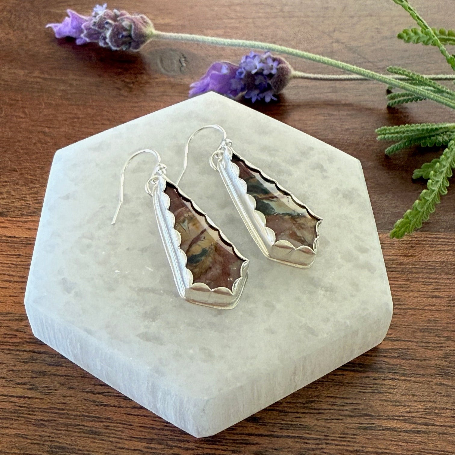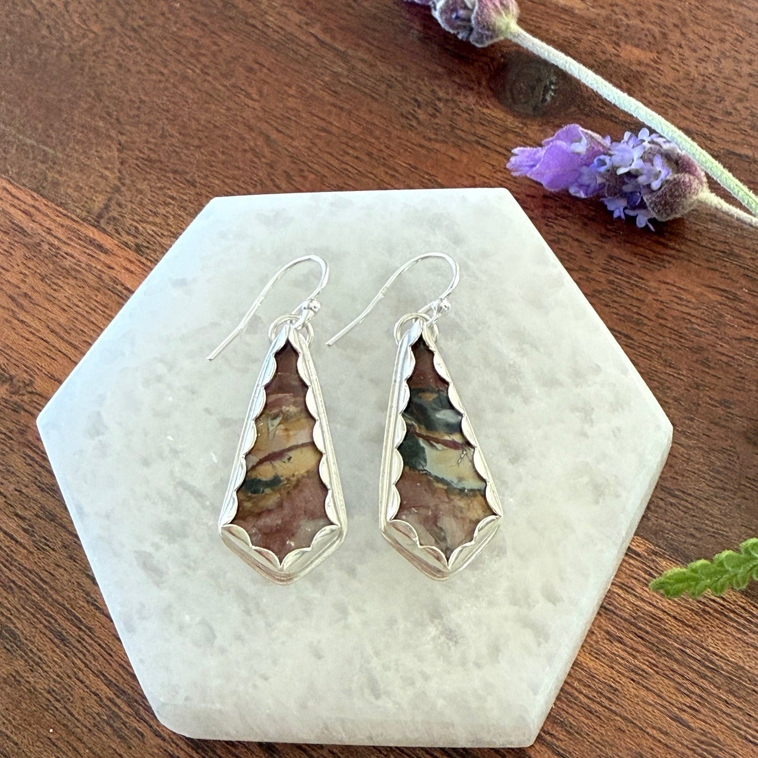 ✨ These earrings are handmade in my Huntington Beach studio using solid sterling silver and carefully selected Mescalero Jasper stones. Each pair is shaped, soldered, and hand-set with care, making them lightweight, meaningful, and full of boho spirit.