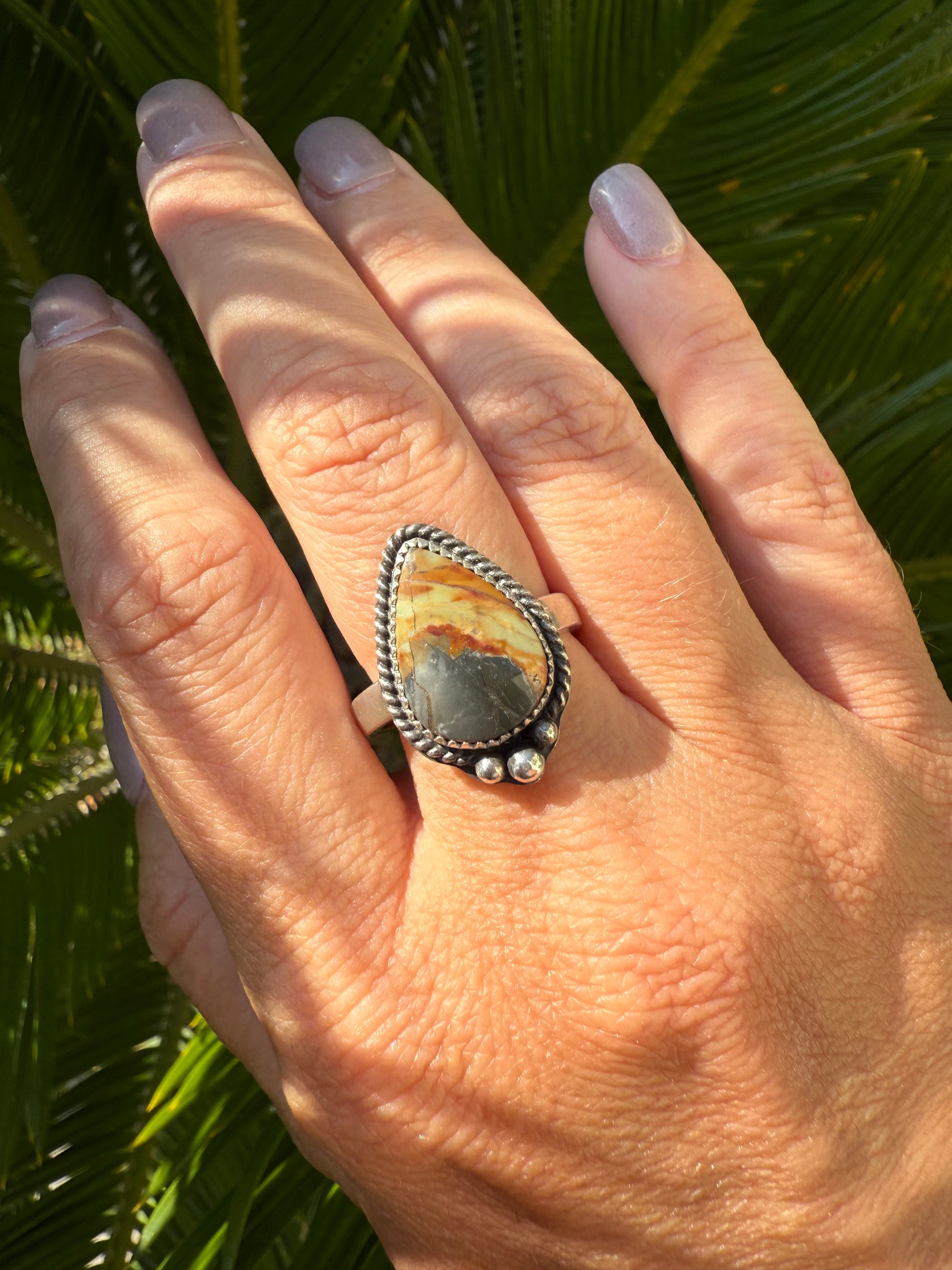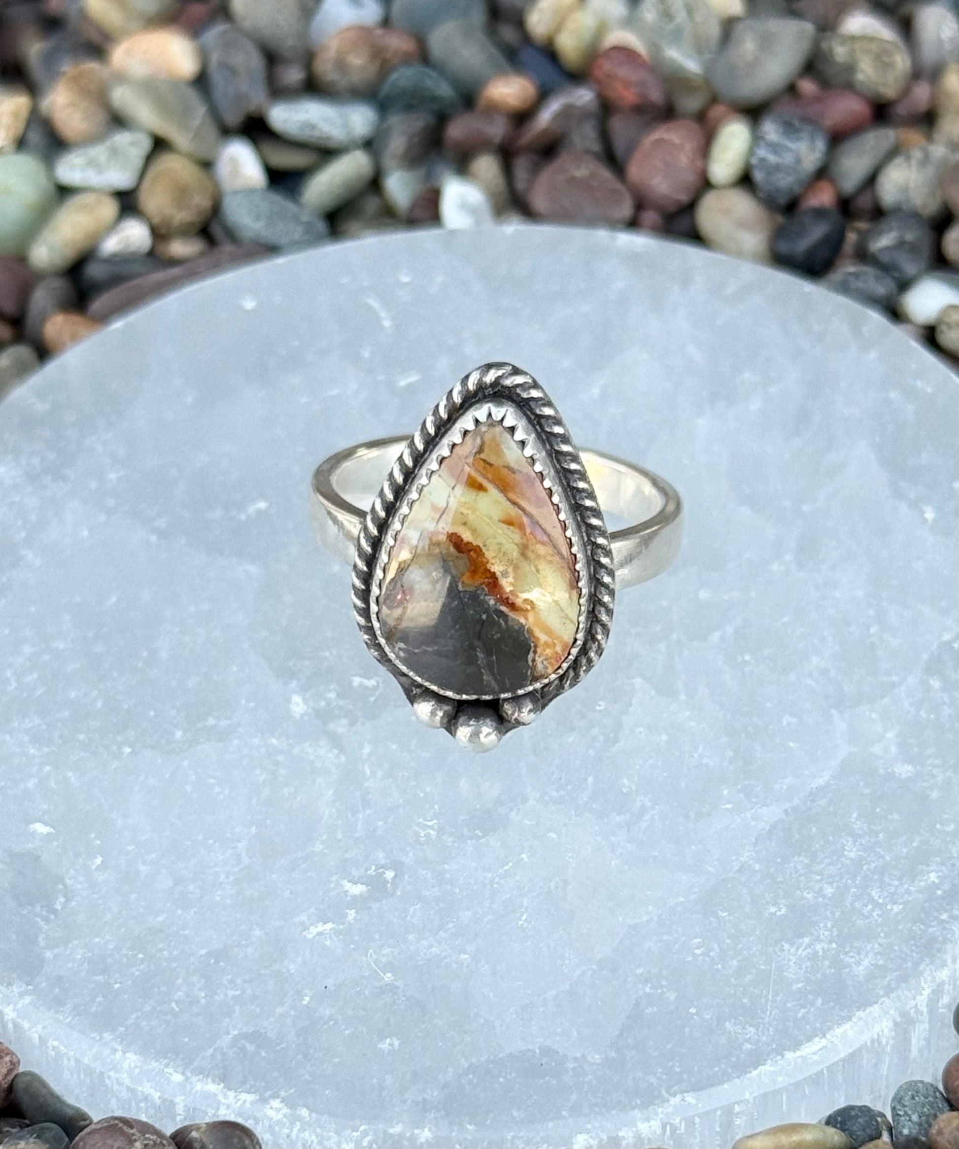 The Mescalero Jasper stone is set around fine silver, the band is sterling silver. This ring is a size 7.5. You will receive the exact ring as pictured.