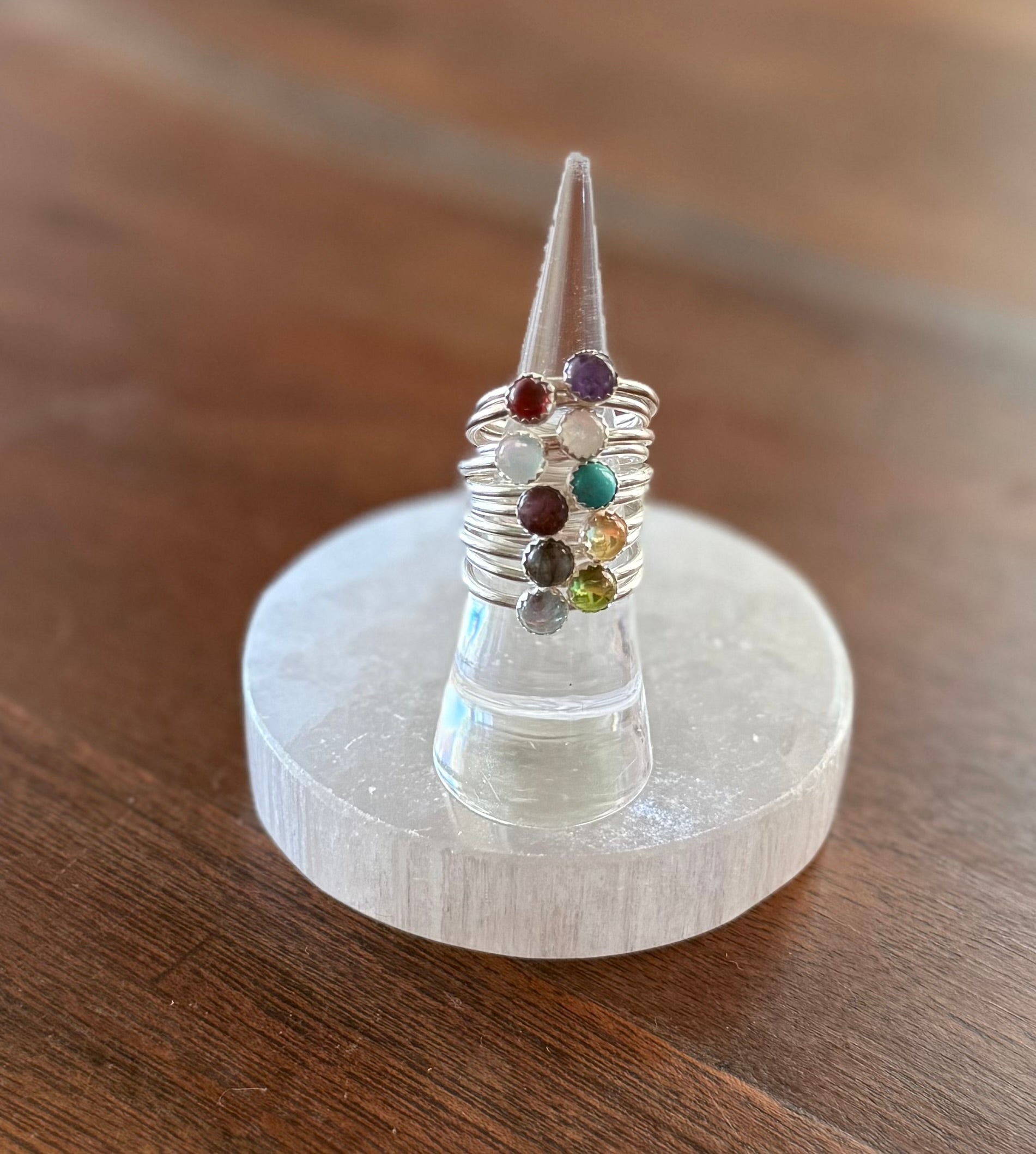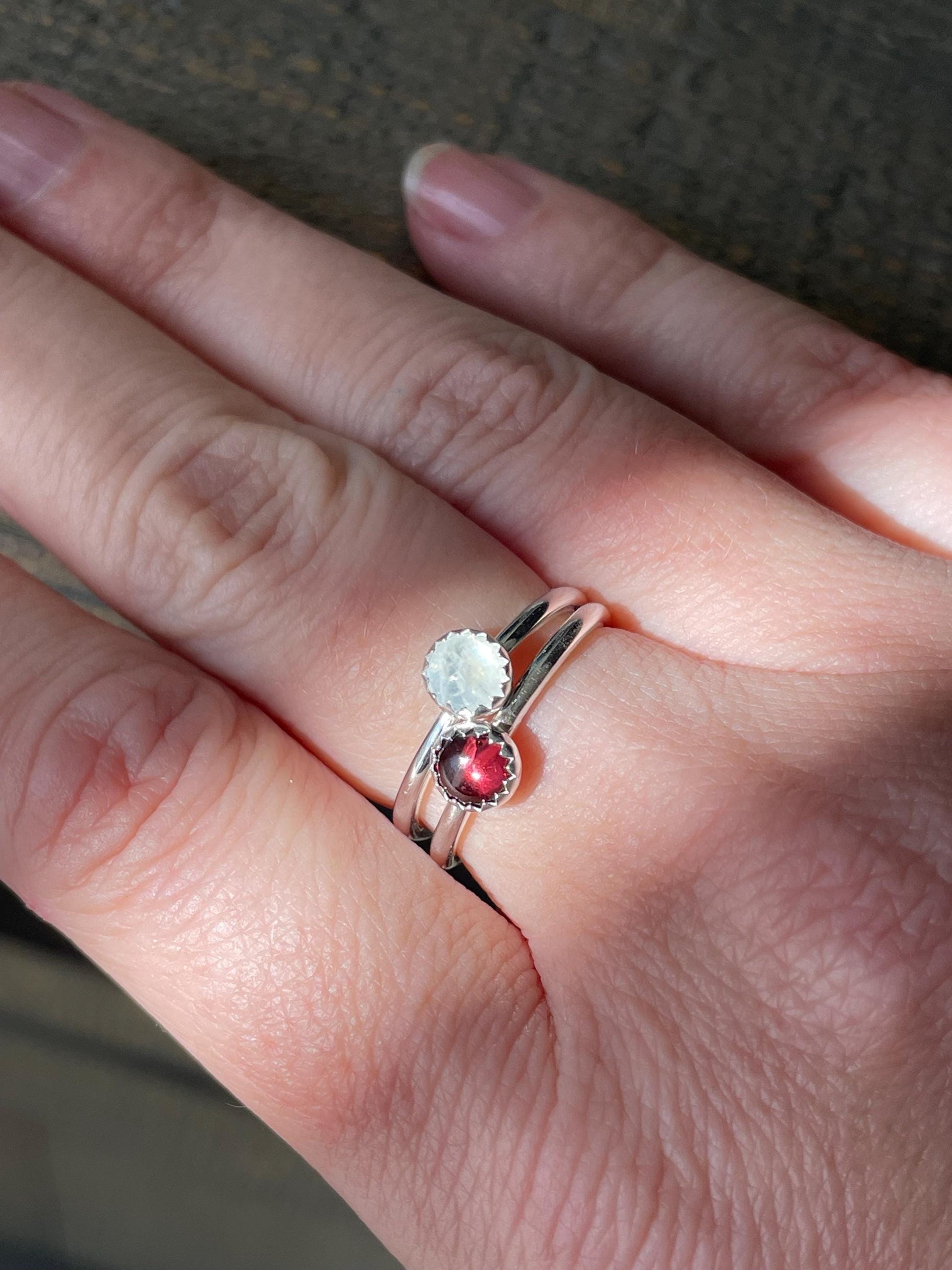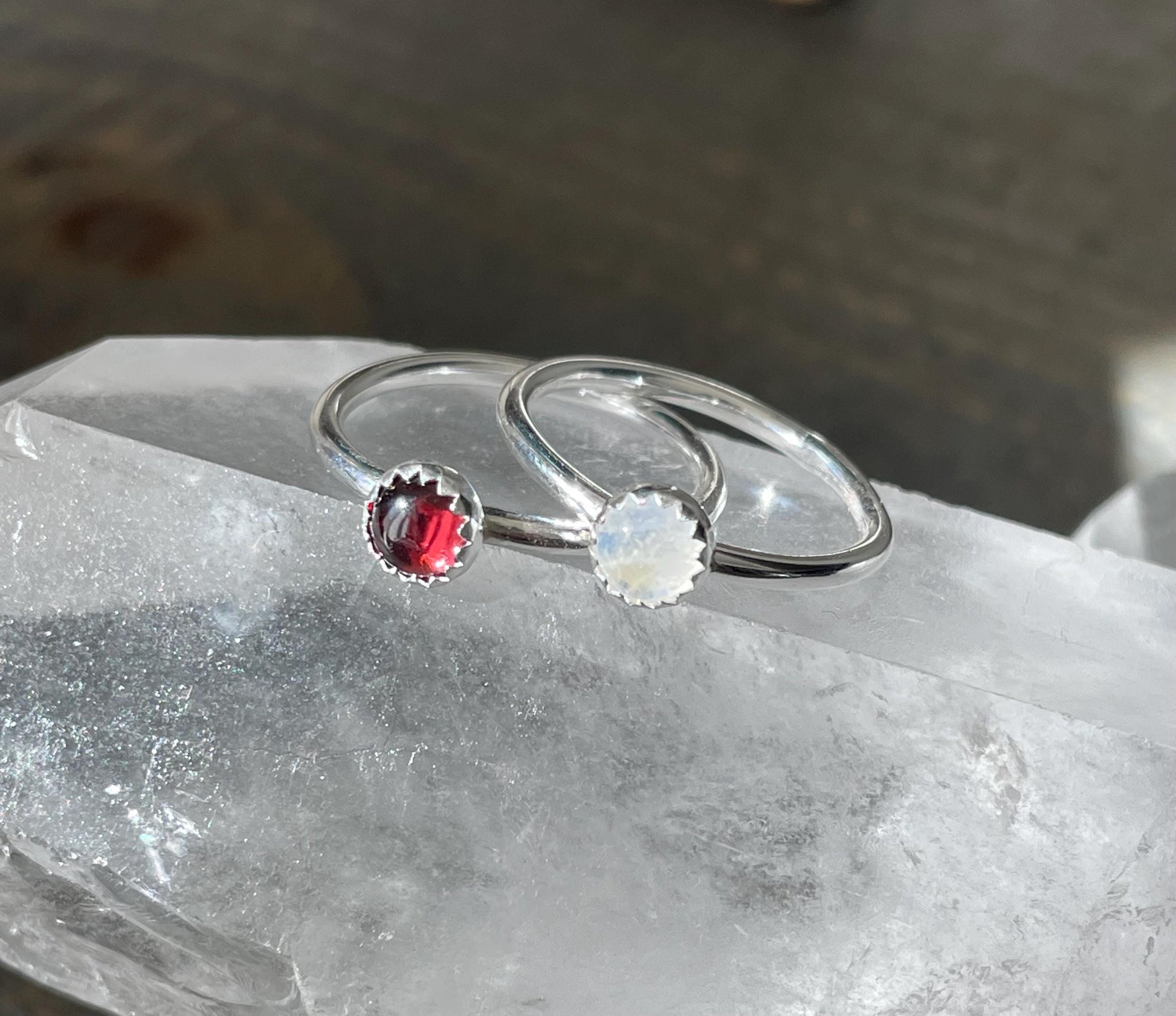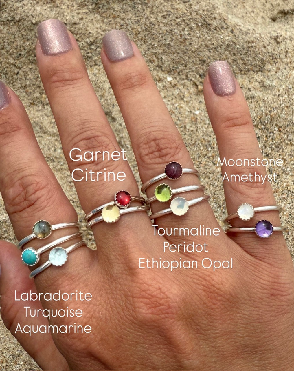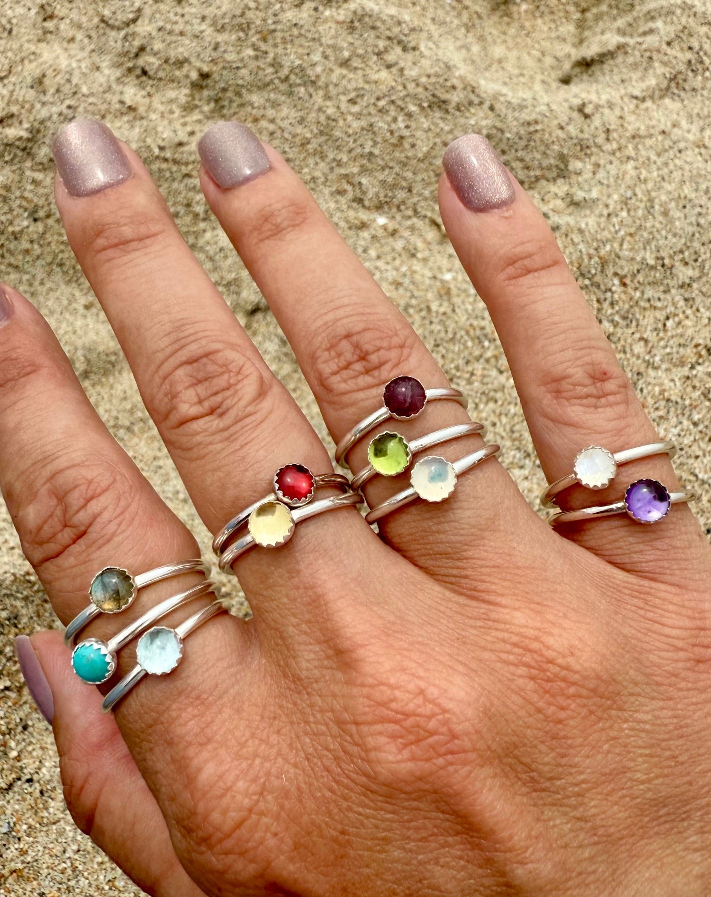 The 5mm stone is set in a sterling silver bezel cup and the ring band is made of 14 gauge sterling silver wire. Select your desired stone and ring size at checkout.
