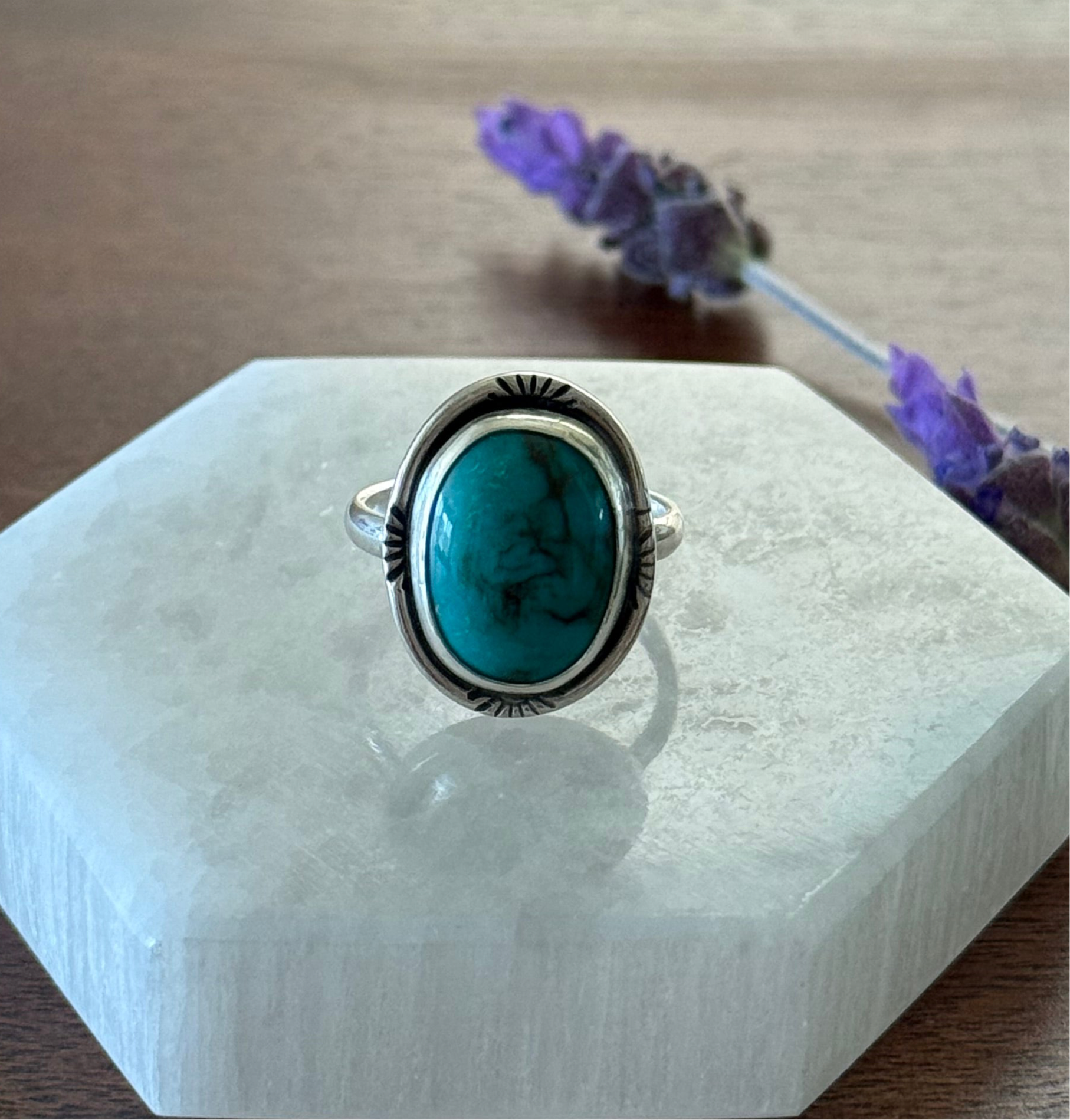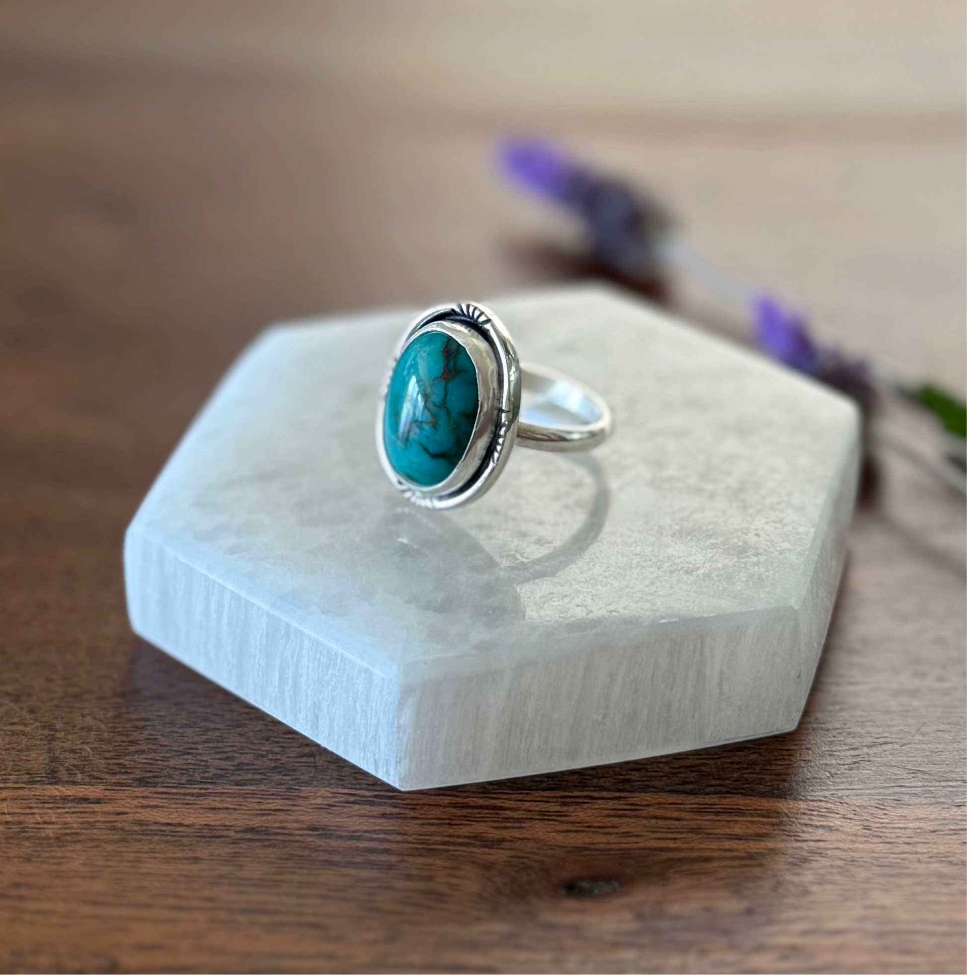 The turquoise stone is set around fine silver, the band is sterling silver. It is a size 6.5 and cannot be resized. You will receive the exact ring as pictured.