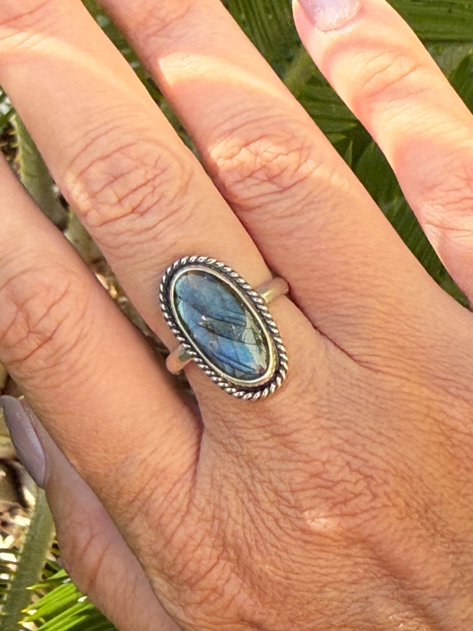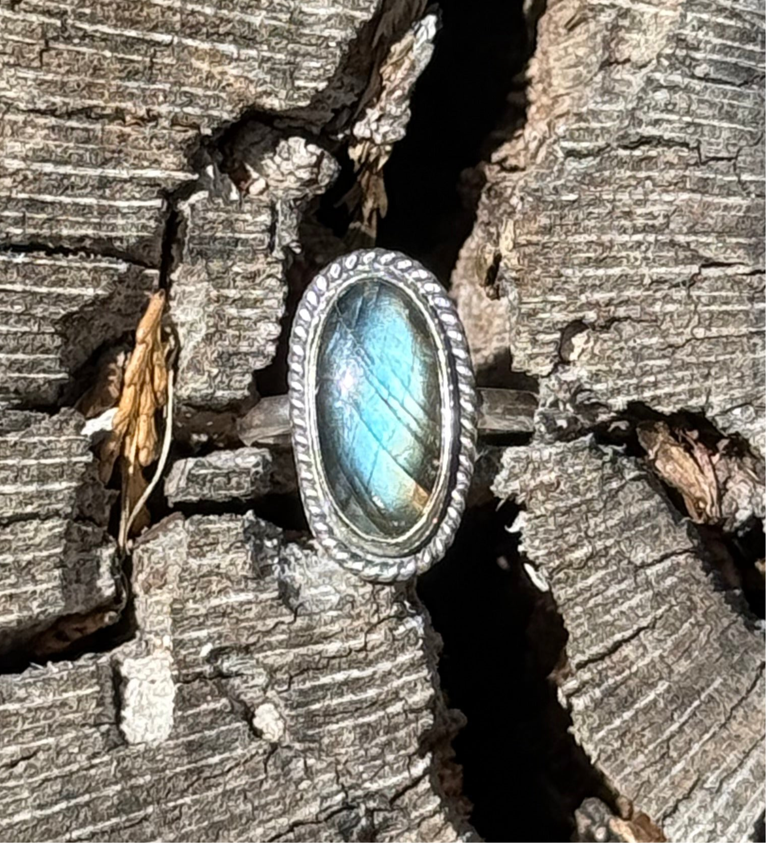 The labradorite stone is set around fine silver, the band is sterling silver. This ring is a size 6.5 and cannot be resized. It measures approximately .75" tall and .50" wide. You will receive the exact ring as pictured.