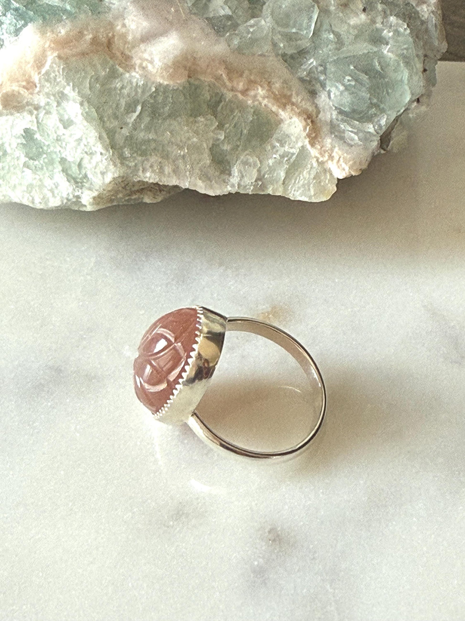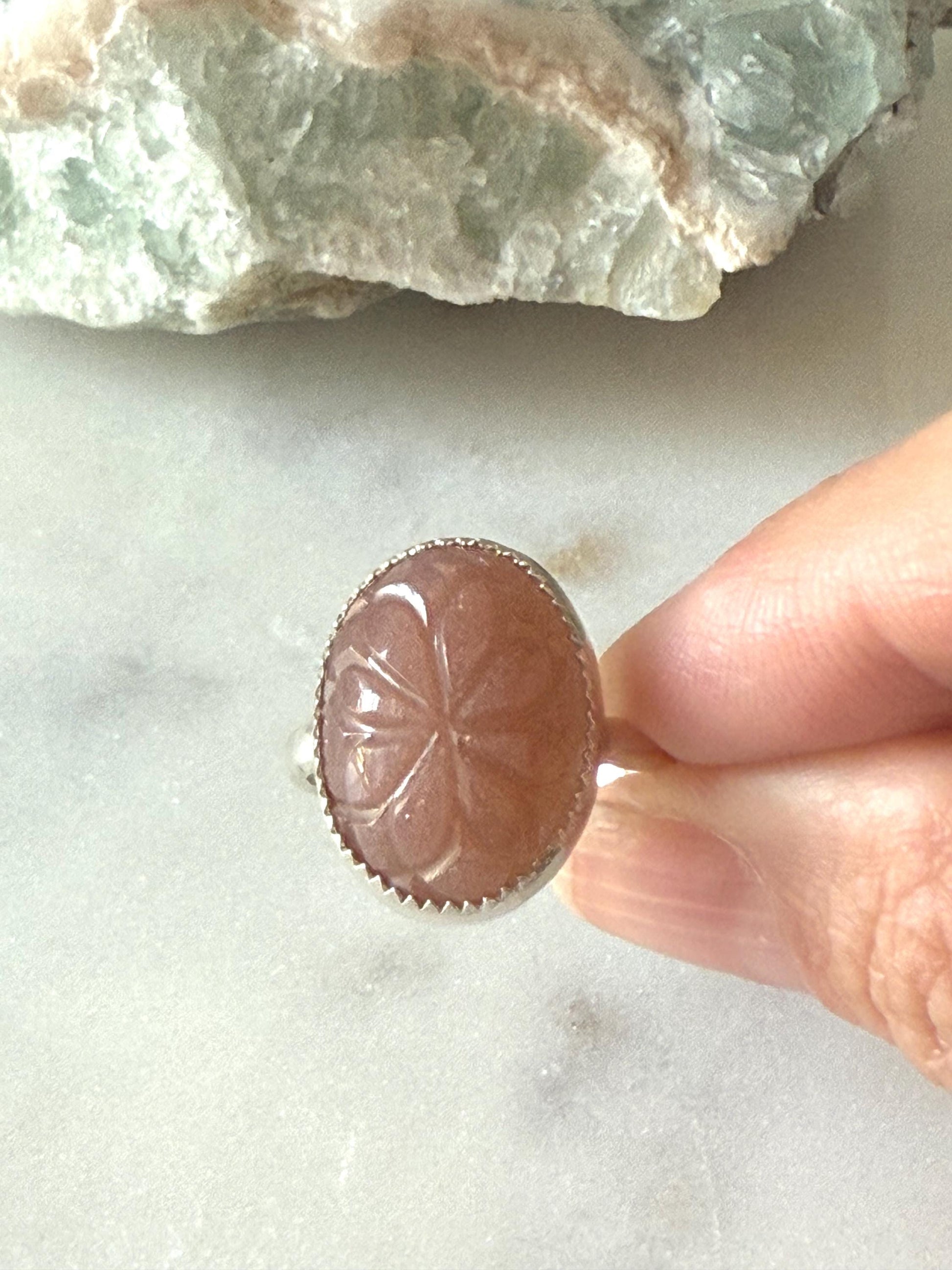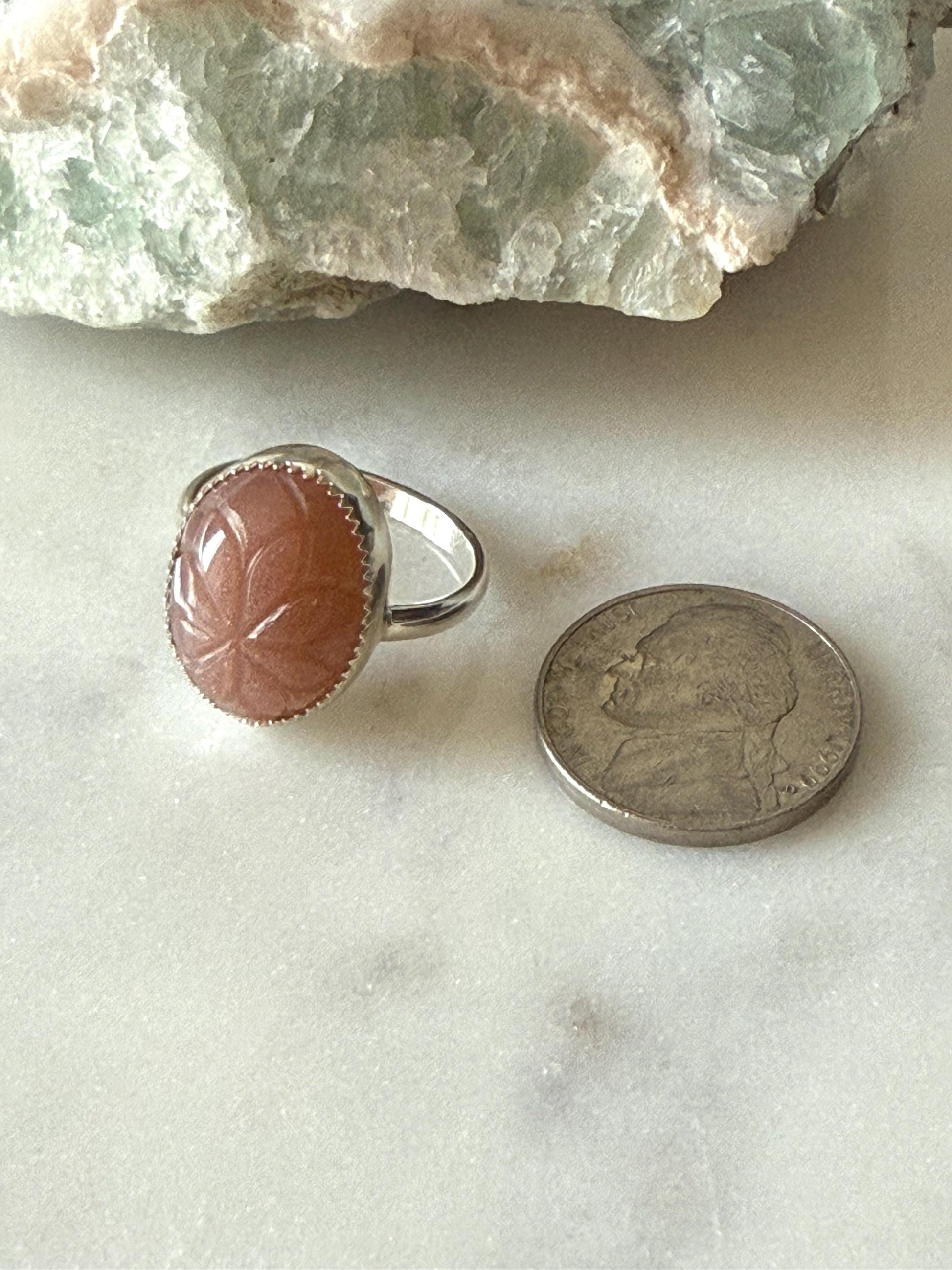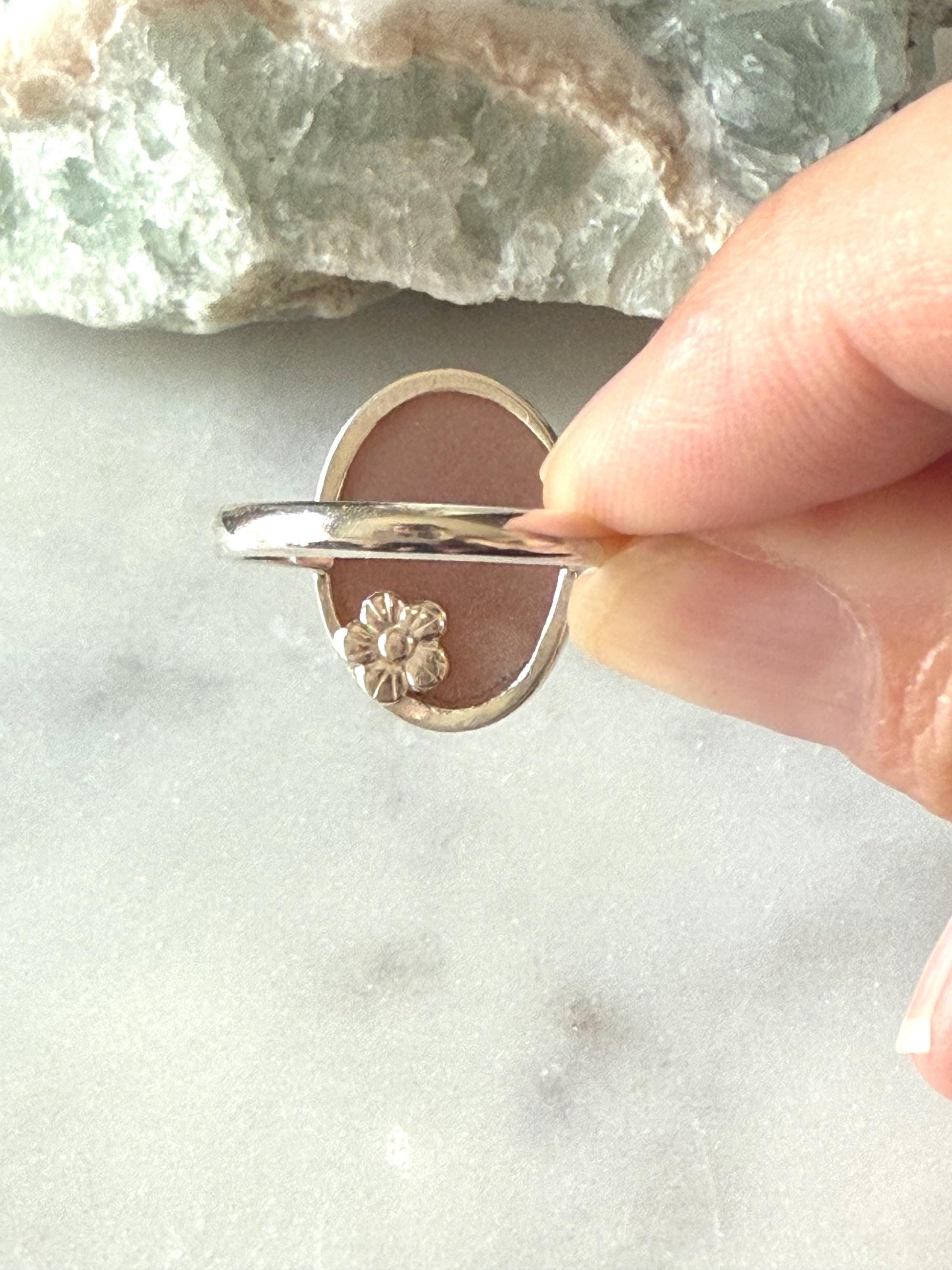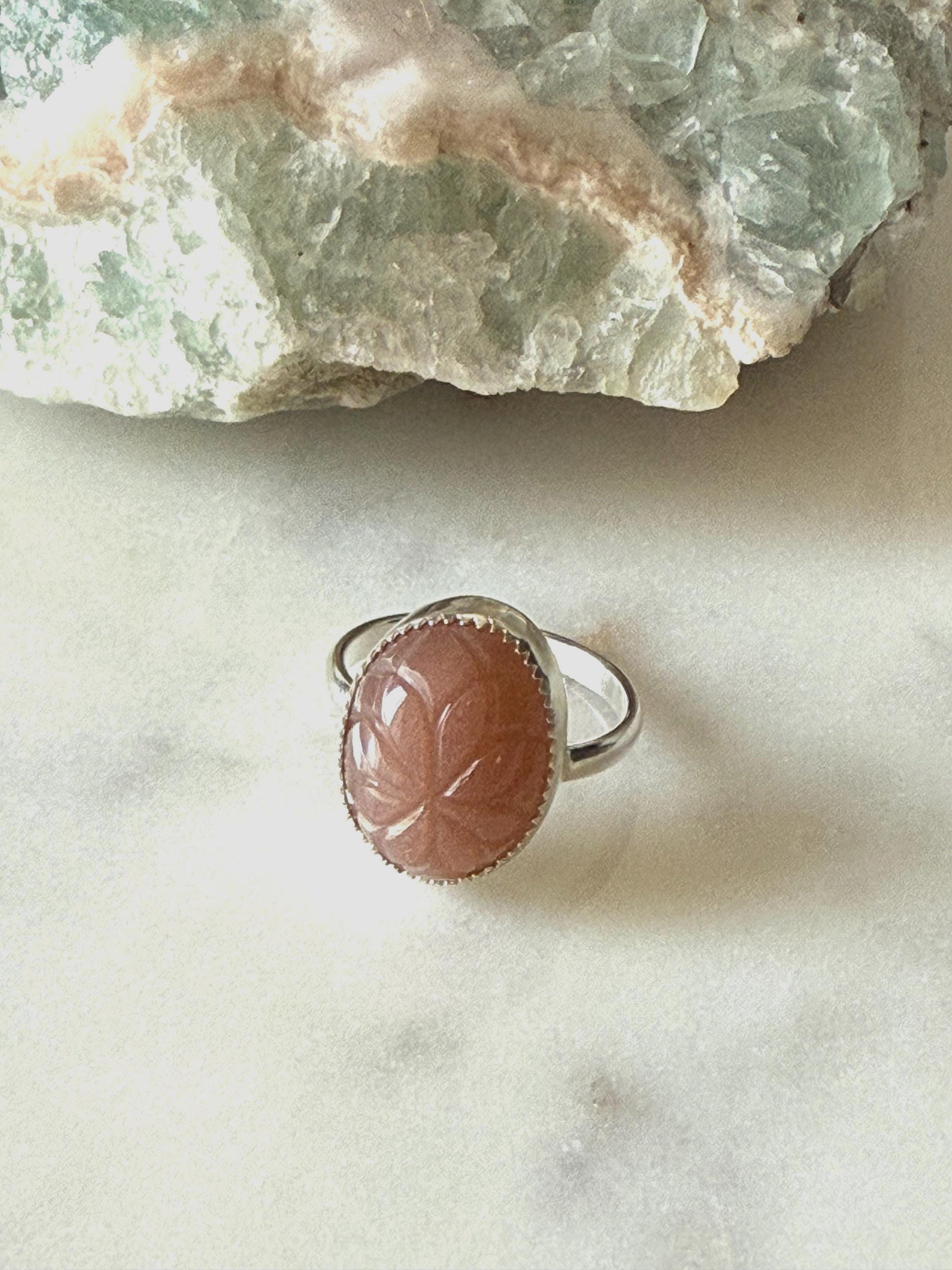 Peach Moonstone is a gentle, nurturing gemstone known for its ability to promote emotional healing and enhance self-love. It is believed to bring comfort, calm, and balance, especially during times of stress or emotional turmoil. Peach moonstone is also thought to support new beginnings, boost intuition, and encourage spiritual growth, making it an ideal stone for those seeking inner peace and personal transformation. Engraved in this peach moonstone is a beautiful flower outline. The ring band is 10g sterling silver. There is a dainty flower that is set on the back. Fine silver wraps around the stone, and sterling silver is used for the band. This ring is a size 6 1/2 and cannot be resized.
