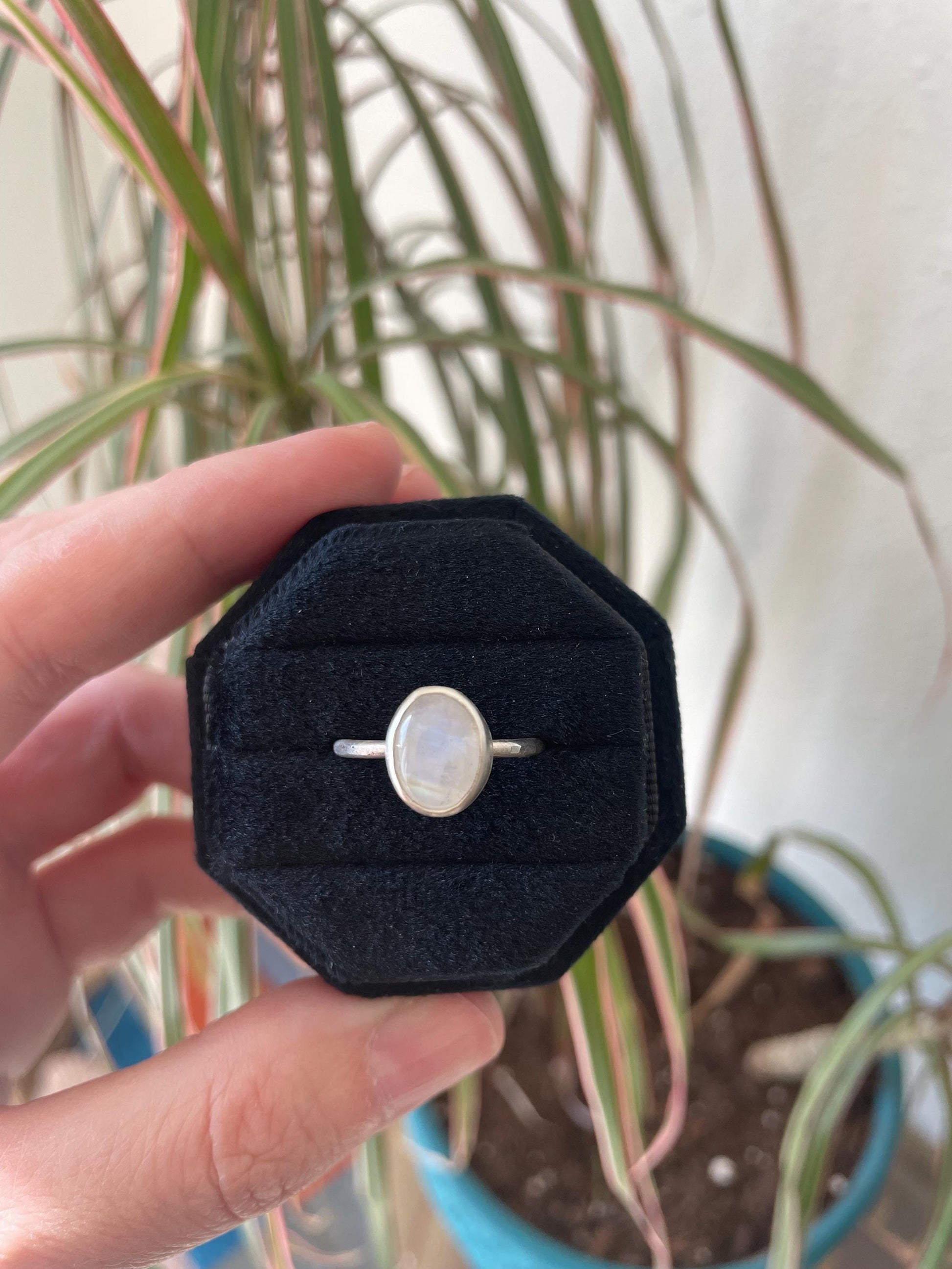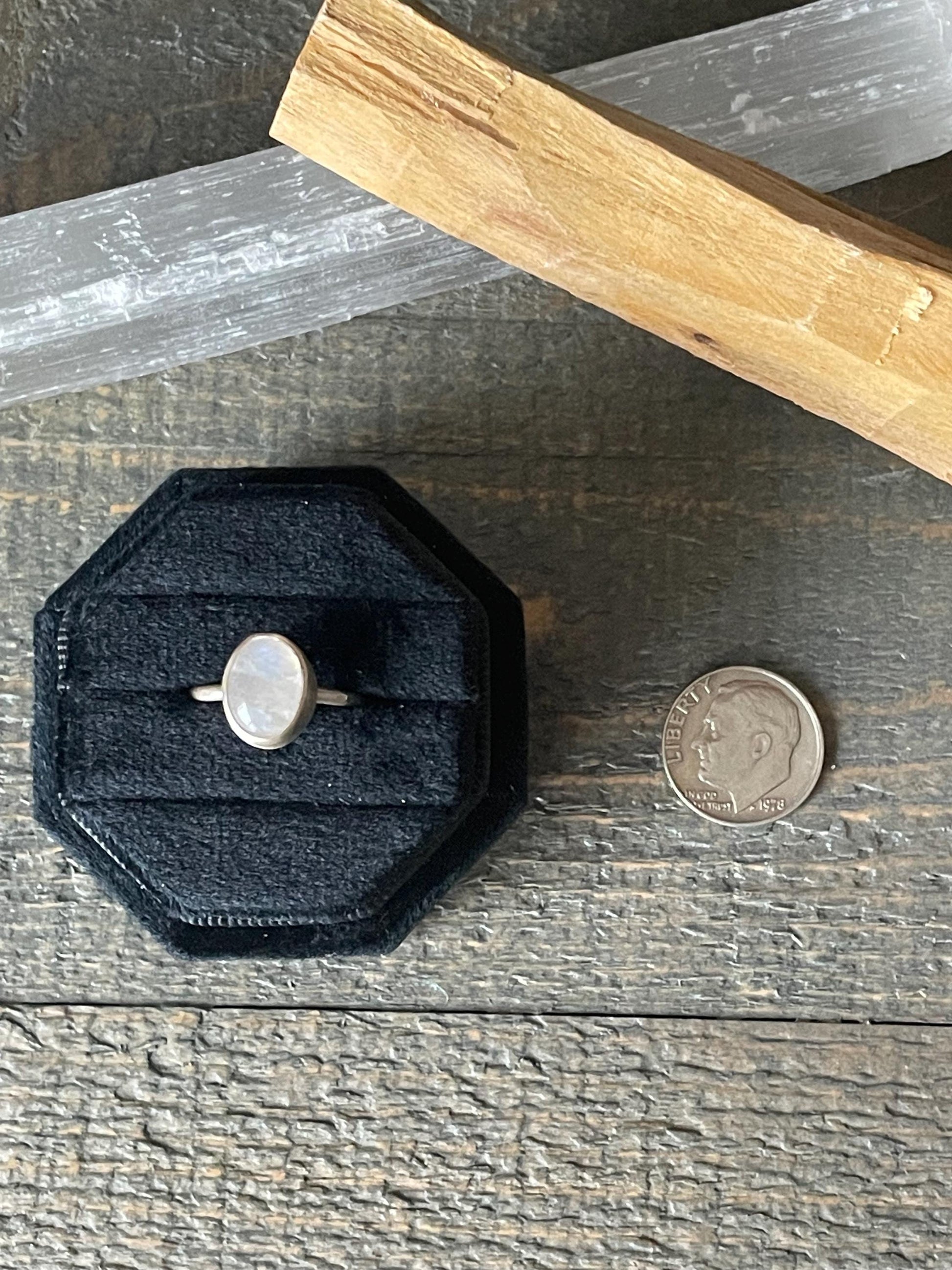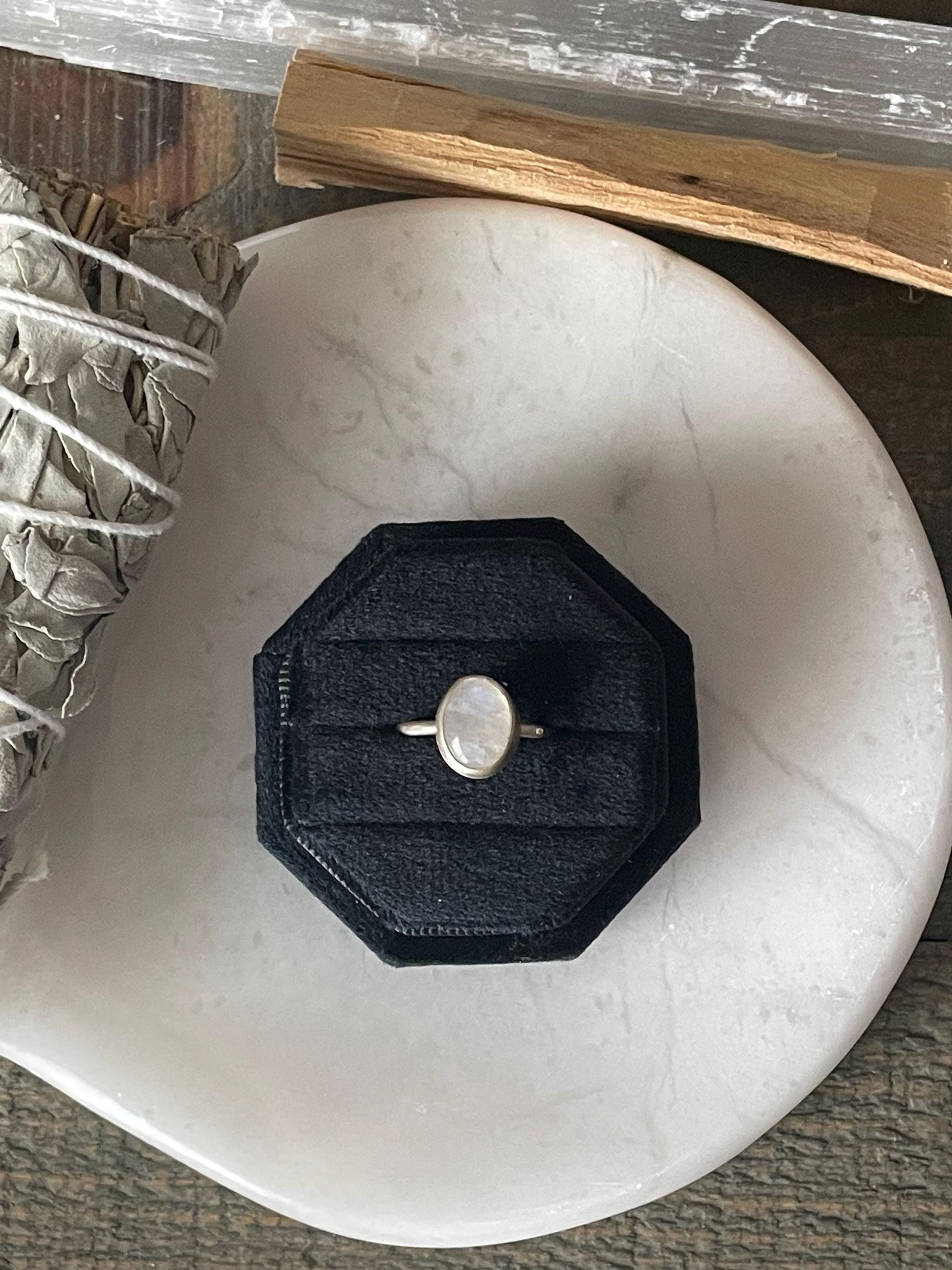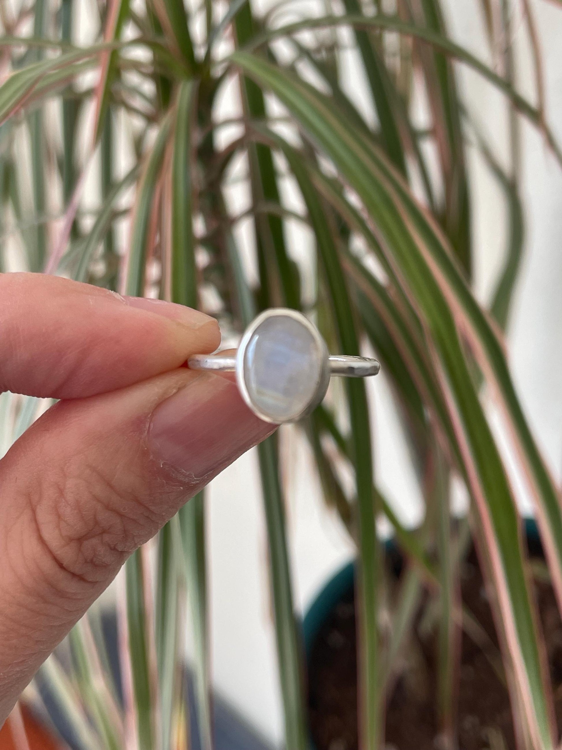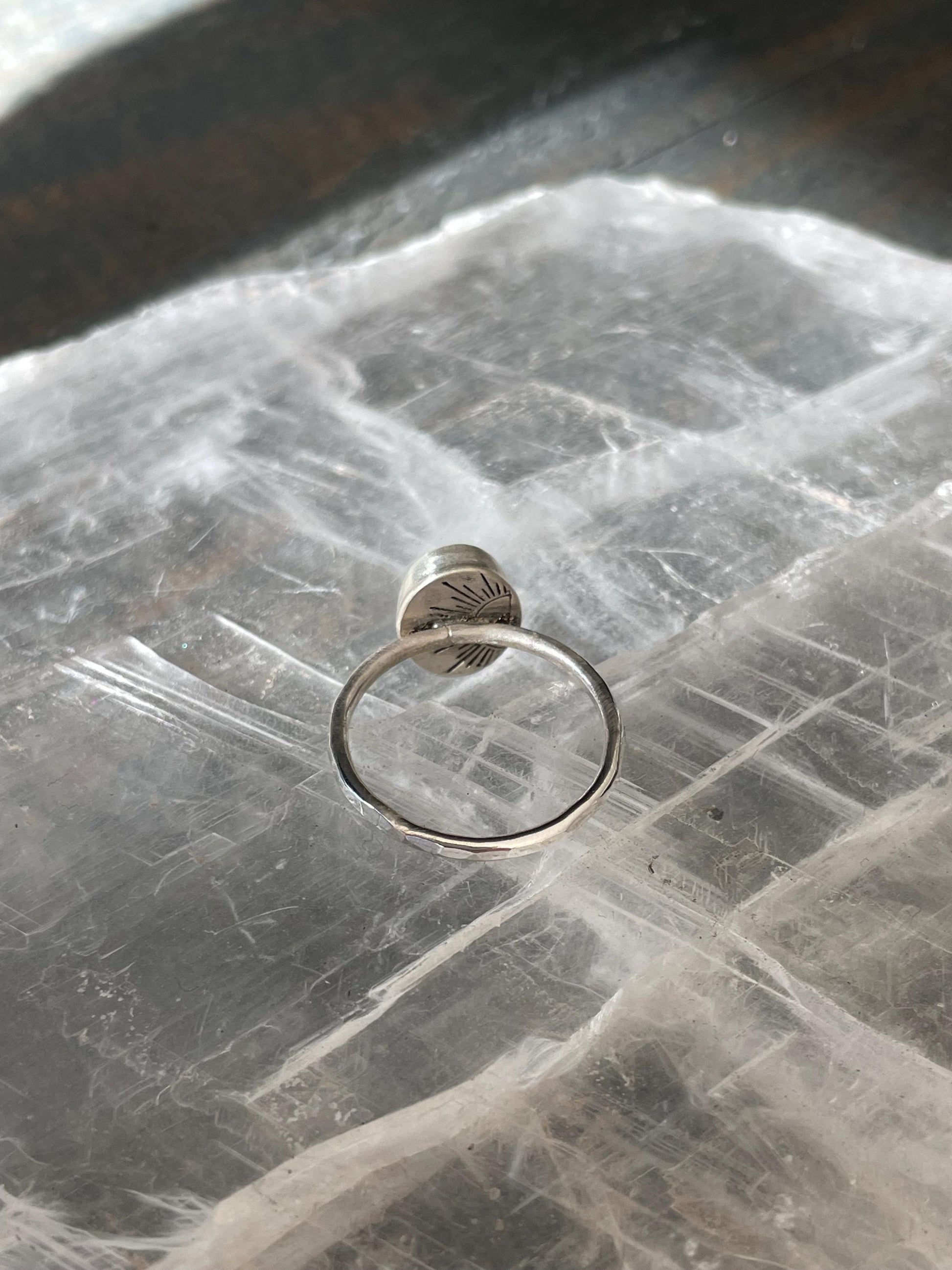 The moonstone cabochon sits around a fine silver bezel which is soldered onto a sterling silver backplate that has our signature radiant sun stamped on the back. The hammered ring band is sterling silver and is a size 7, It cannot be resized. You will receive the exact ring as pictured.