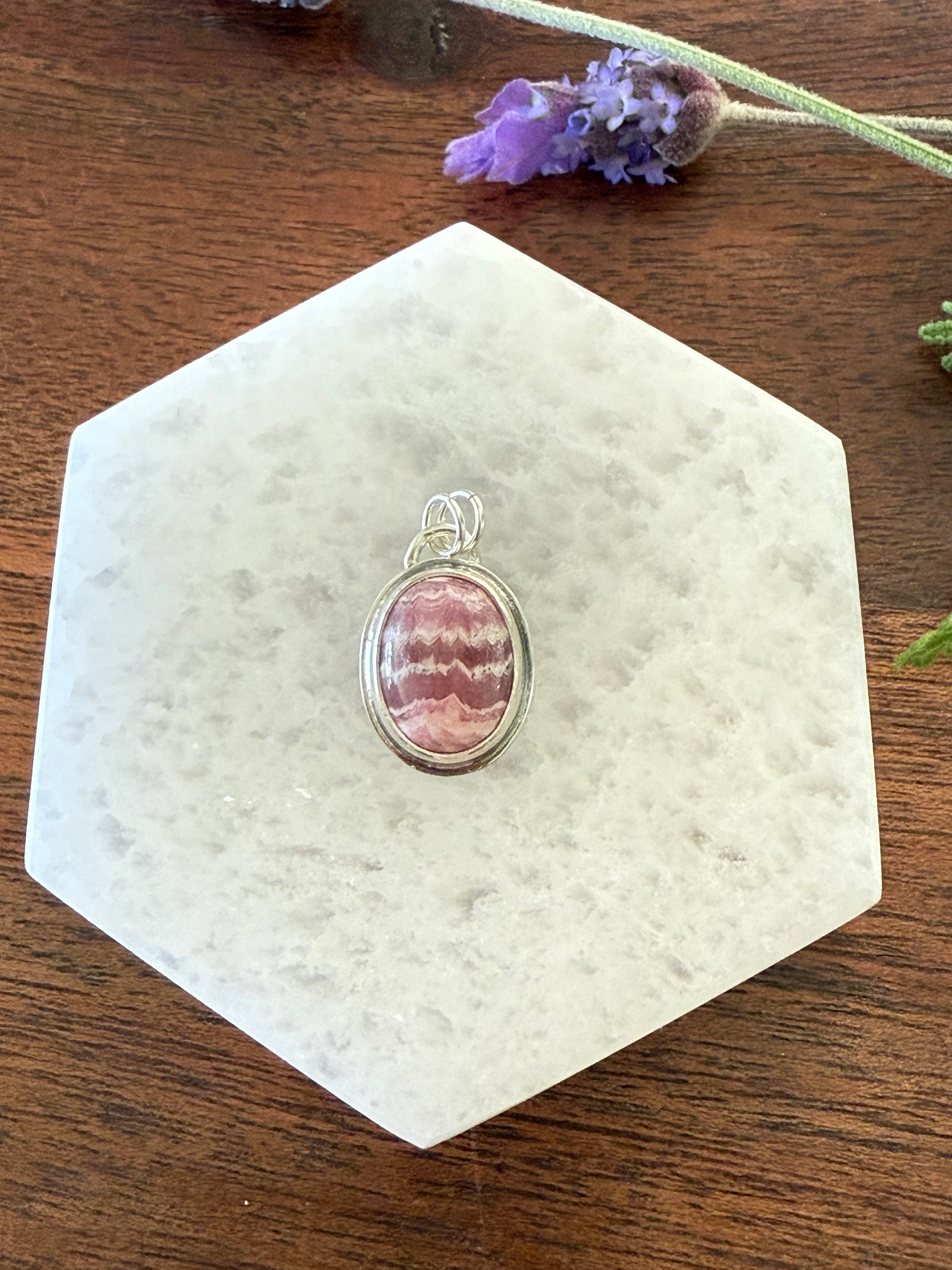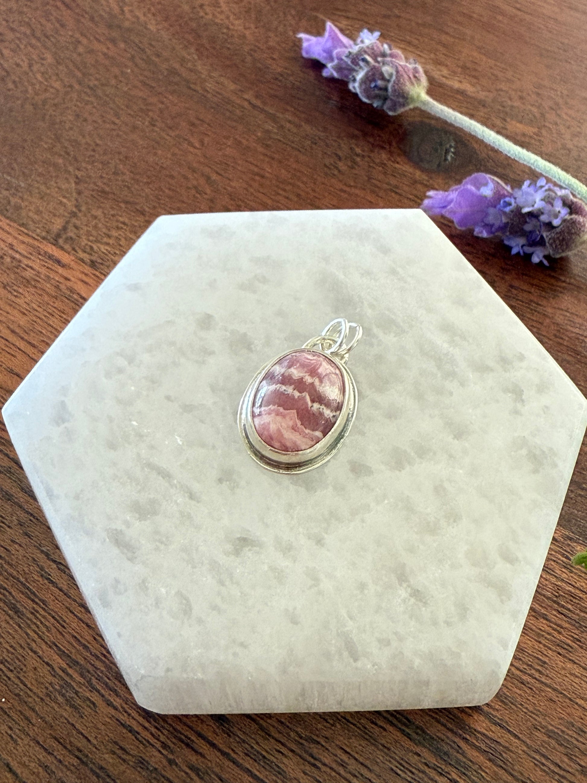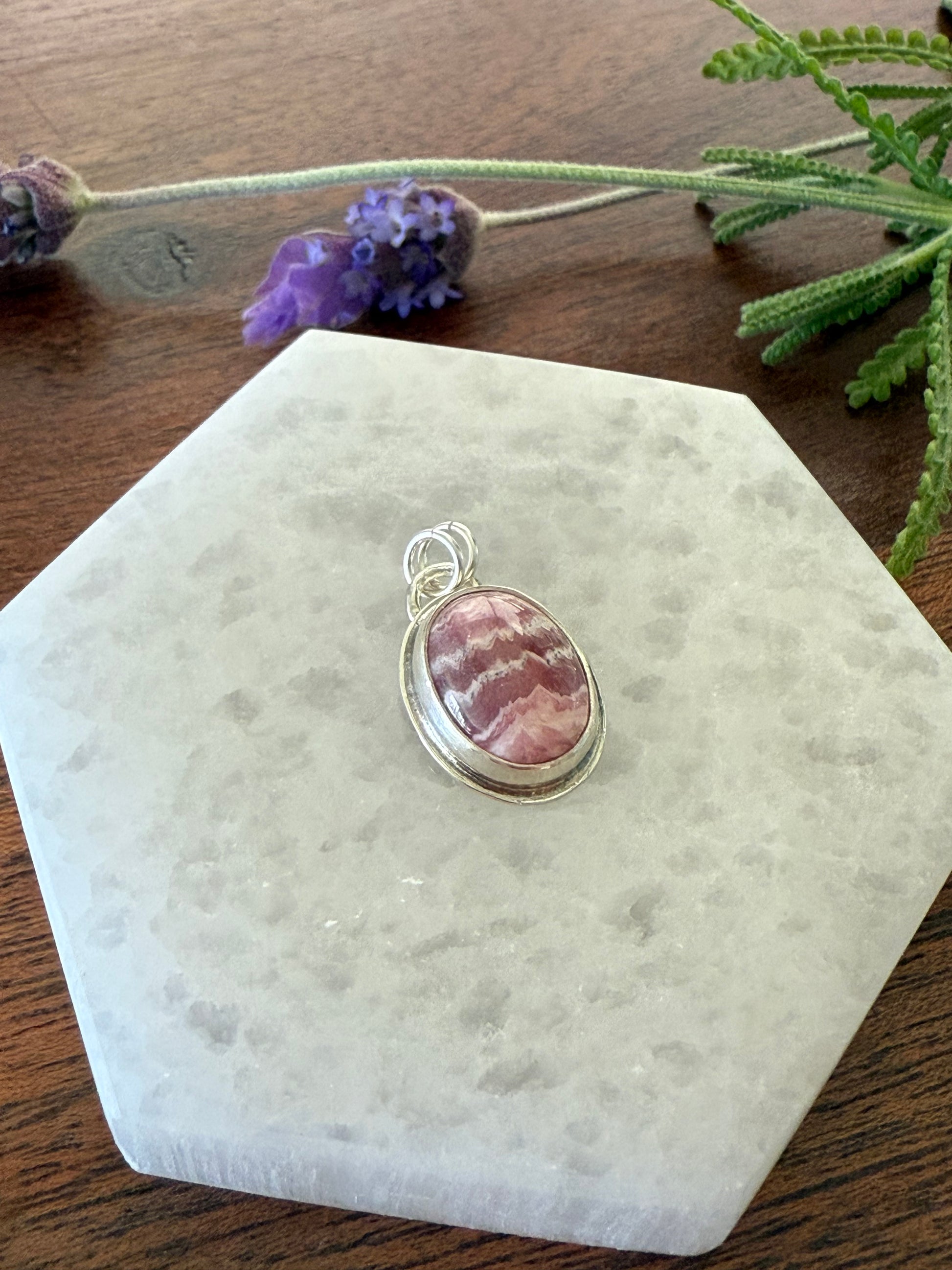 Rhodochrosite Pendant made with fine and sterling silver. Stamped on the back is a mandala flower. You will receive the exact pendant only. *shown with rolo chain which can be purchased in the shop.