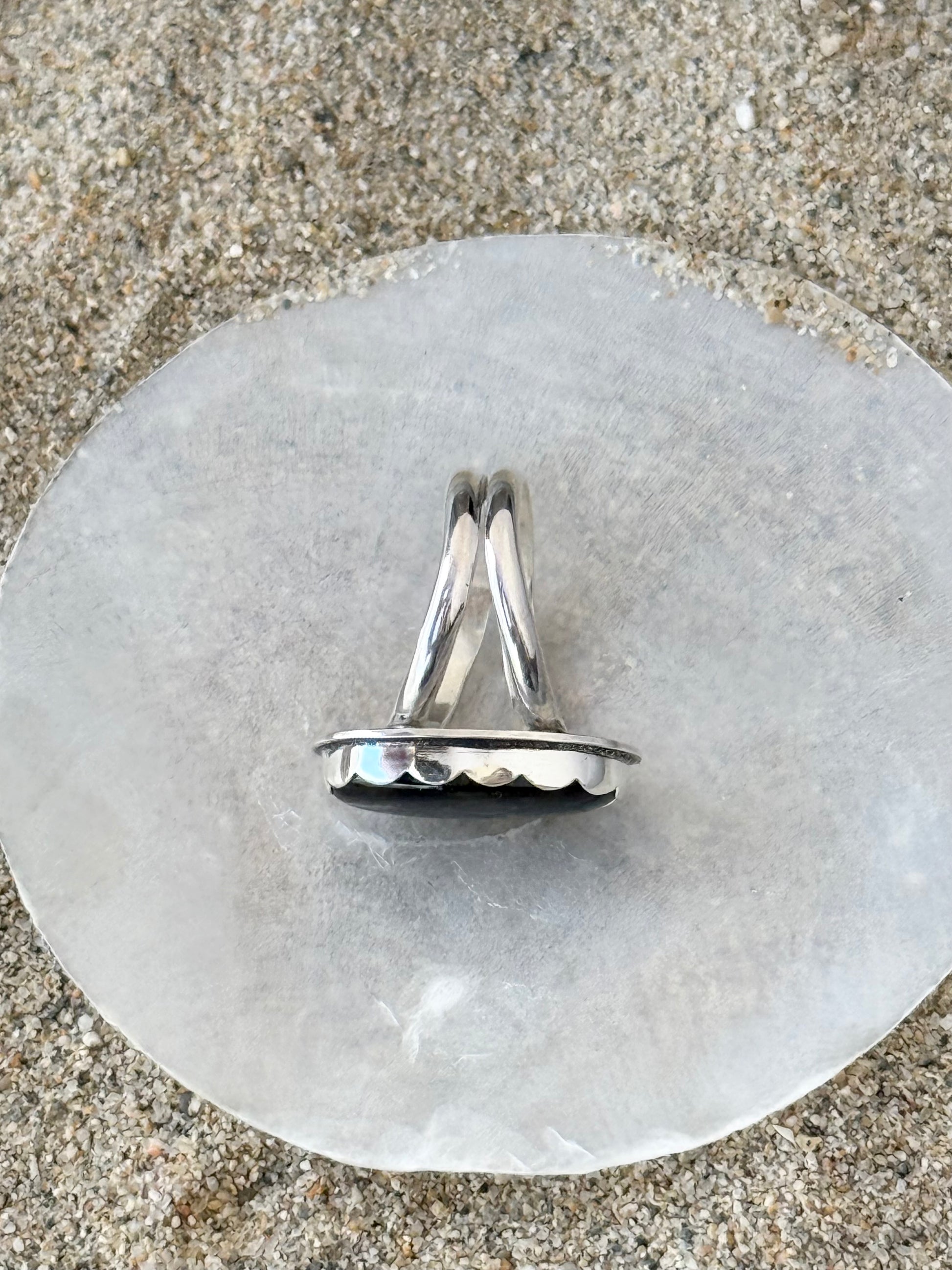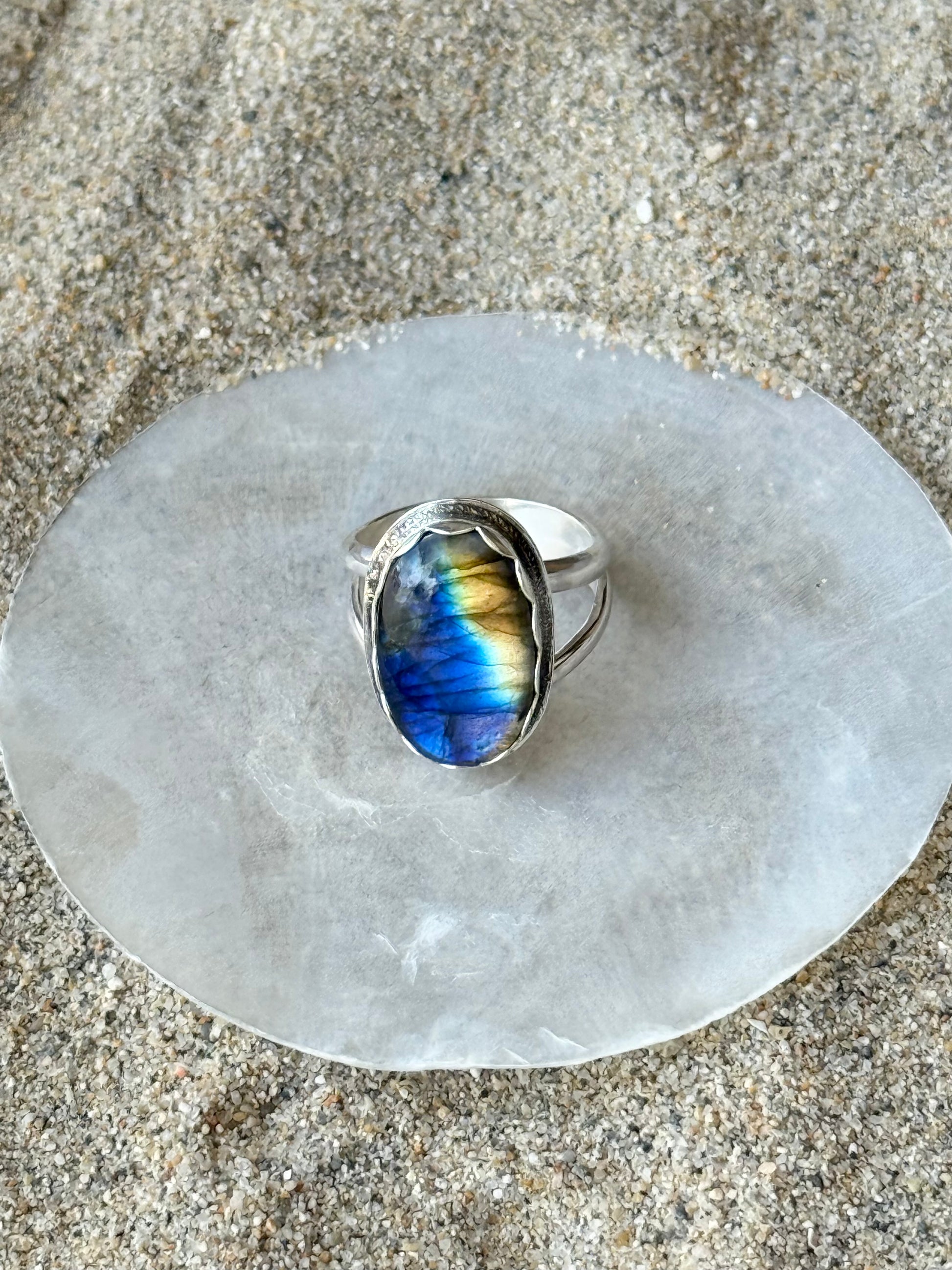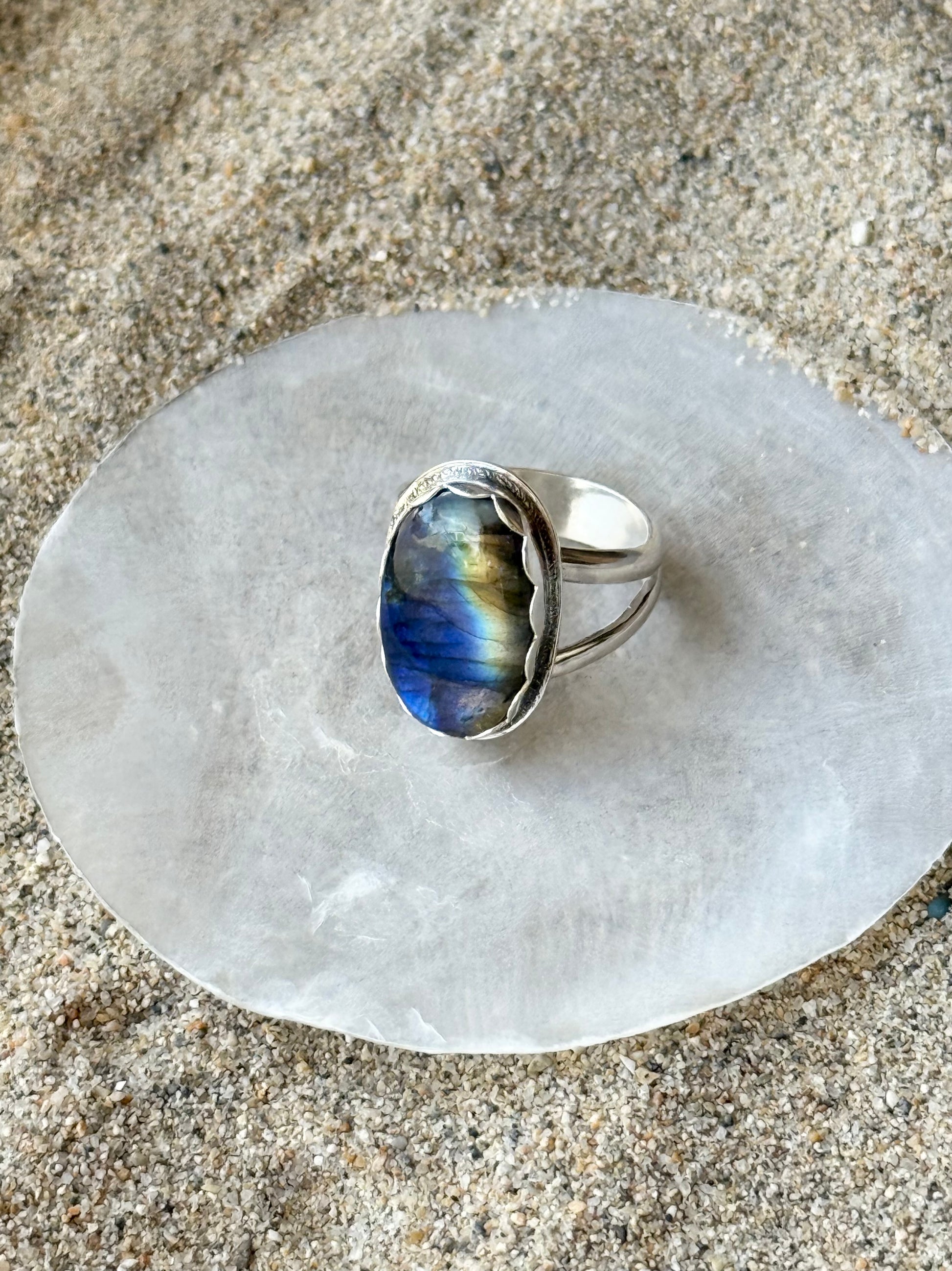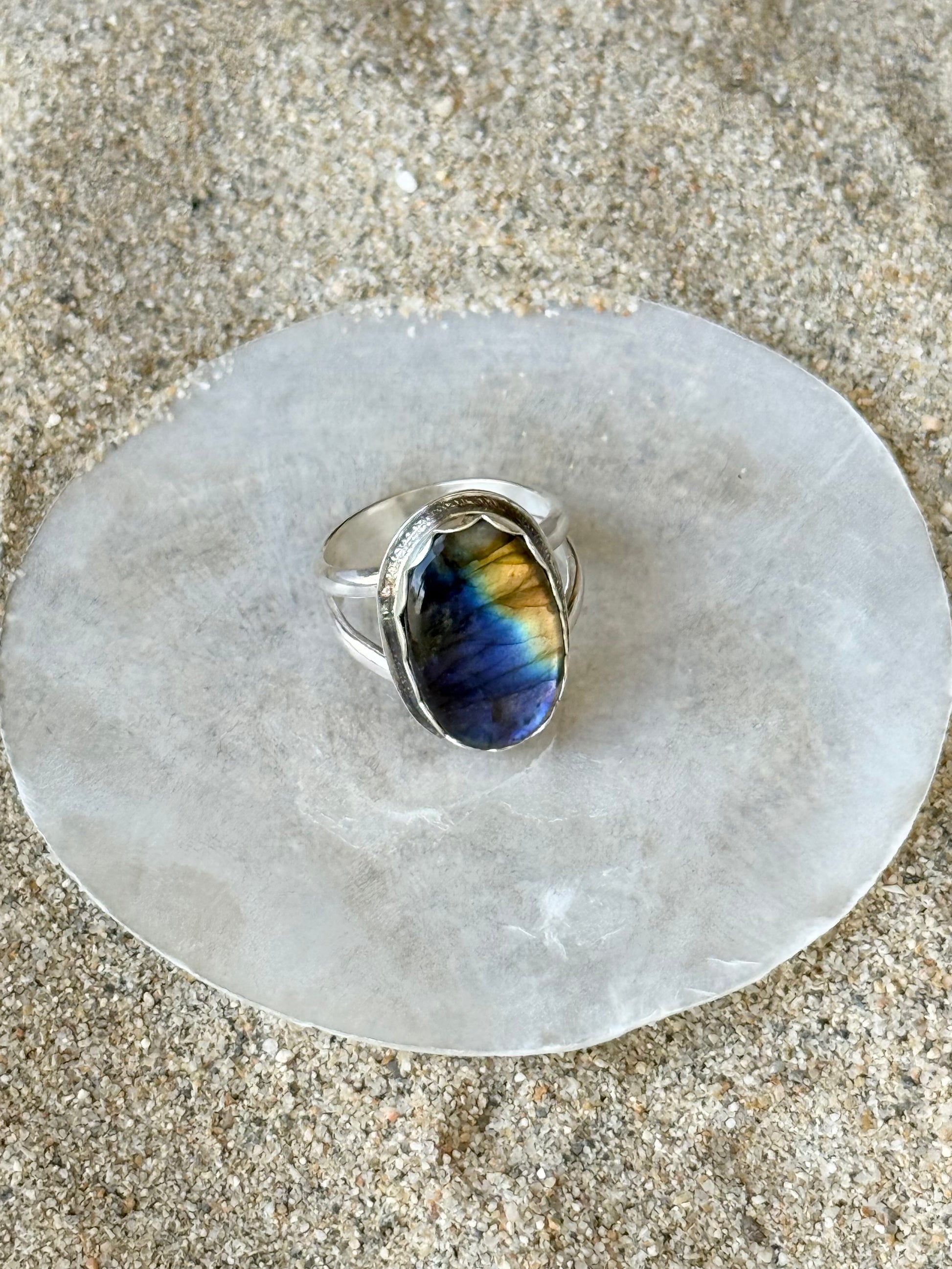 The labradorite stone is set around fine silver, the split band is sterling silver. This ring is a size 7.5 and cannot be resized. It has our signature evil eye radiant sun stamped on the back along with 925. You will receive the exact ring as pictured.