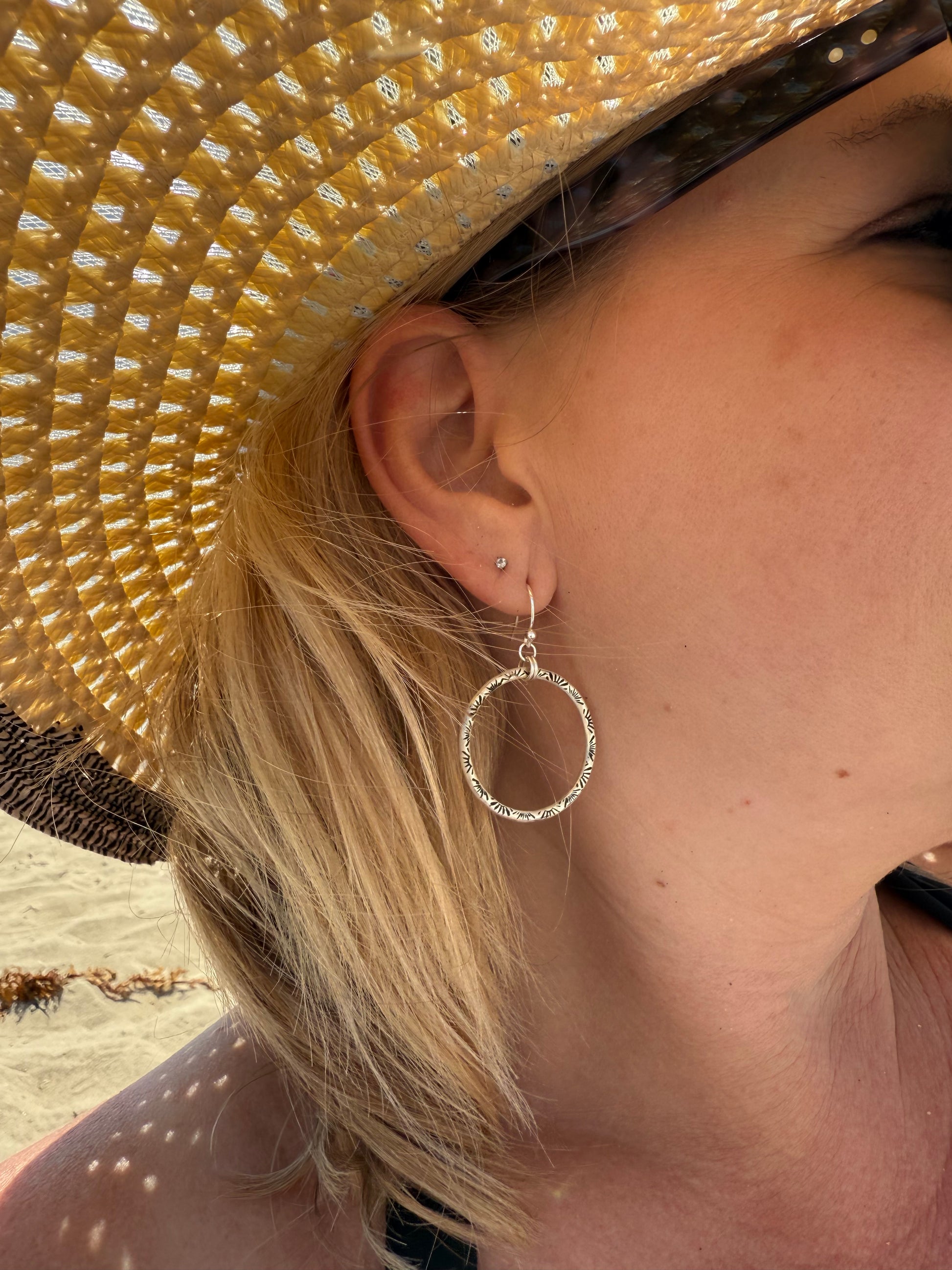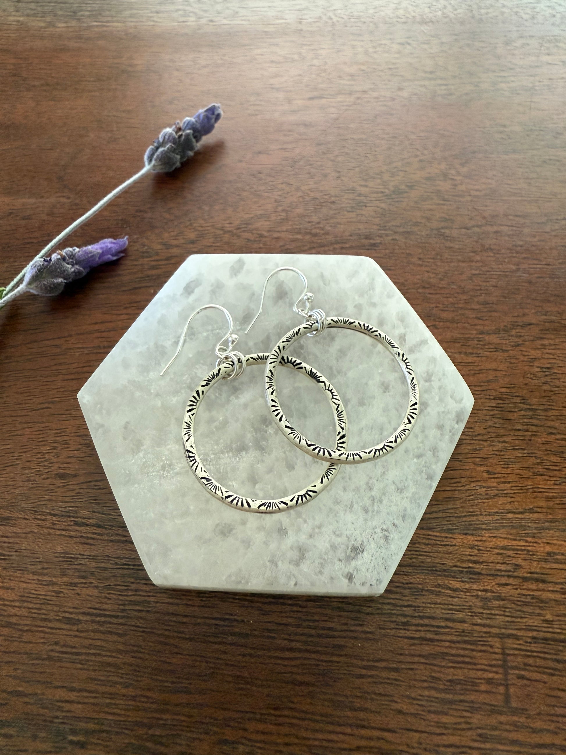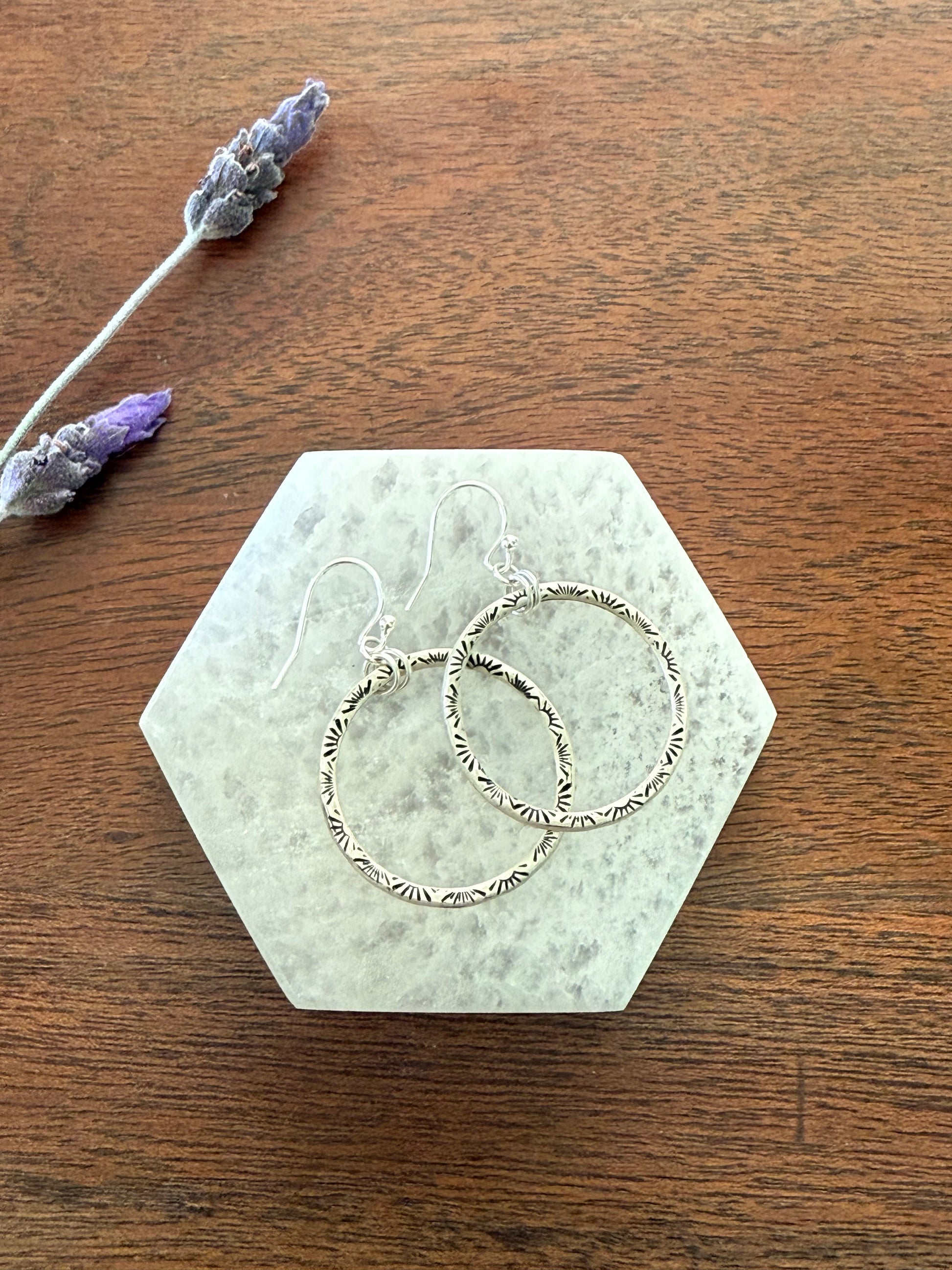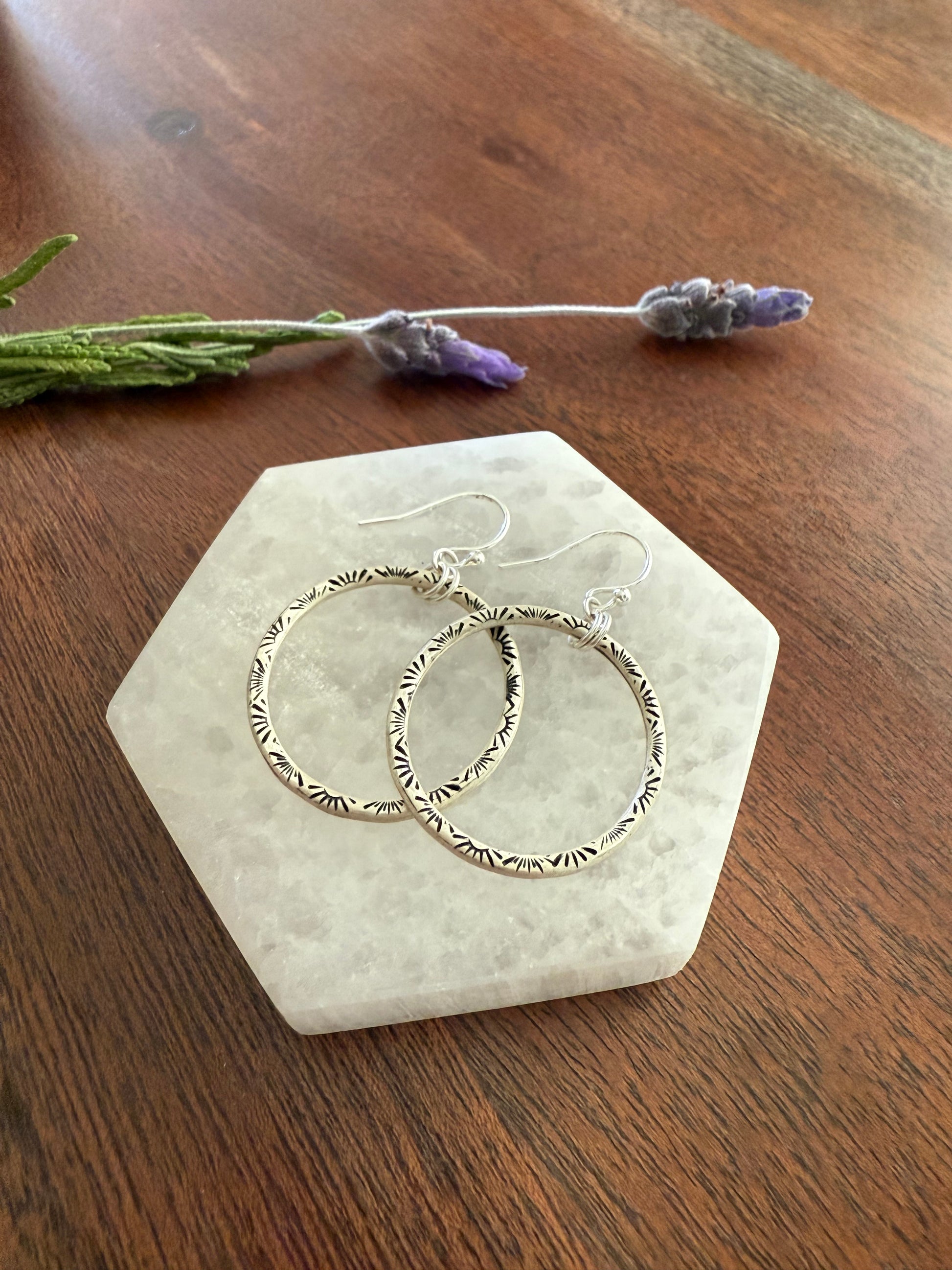These sterling silver hoop earrings can be worn everyday with any outfit! They are made entirely of sterling silver, and carefully stamped with a radiant sun stamp on the front side.