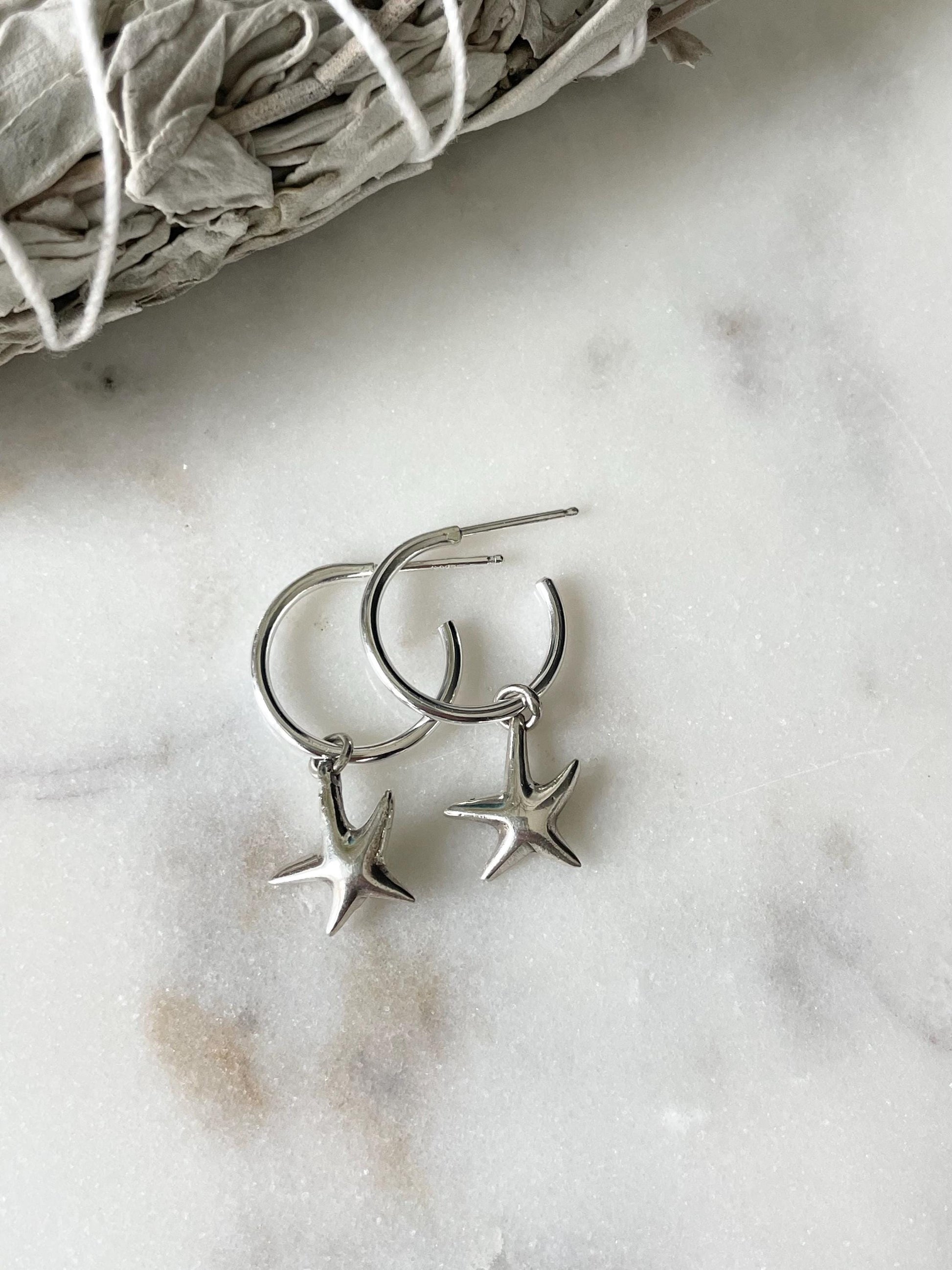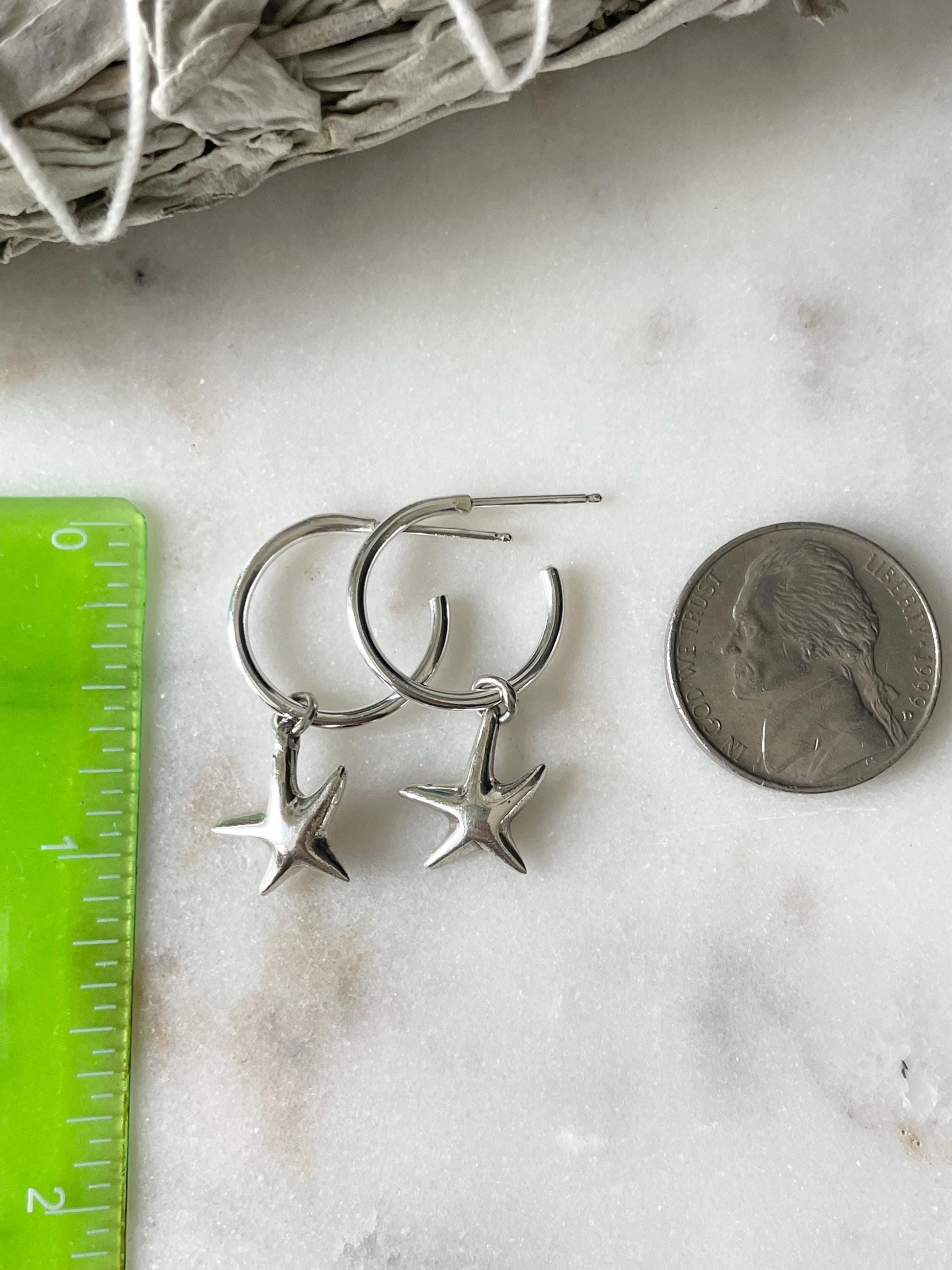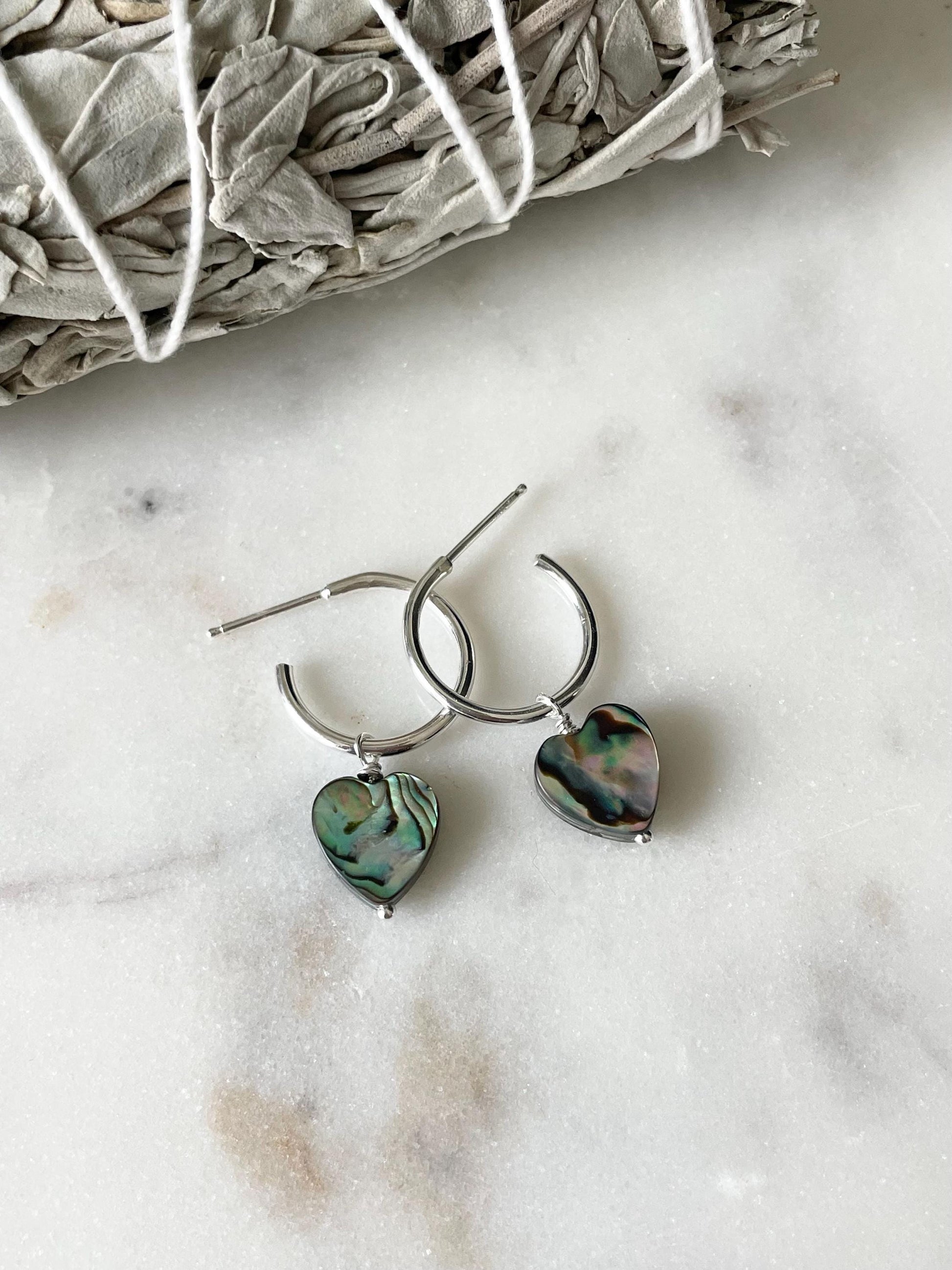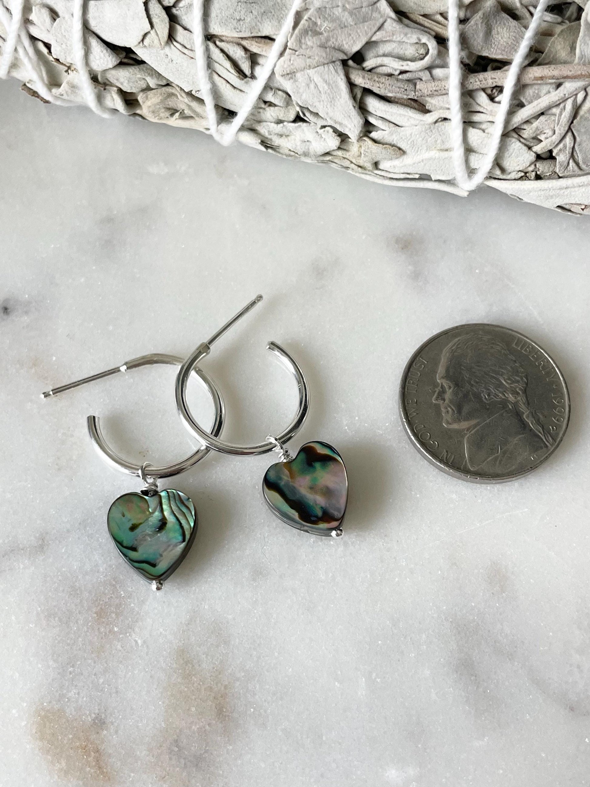 These hoop earrings are made with 14g sterling silver. You can select the sterling silver starfish charms or the heart abalone charms at checkout.