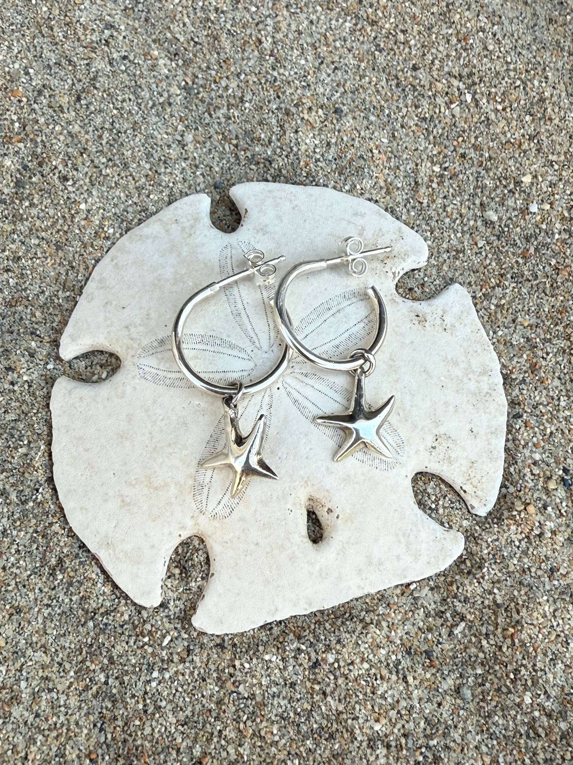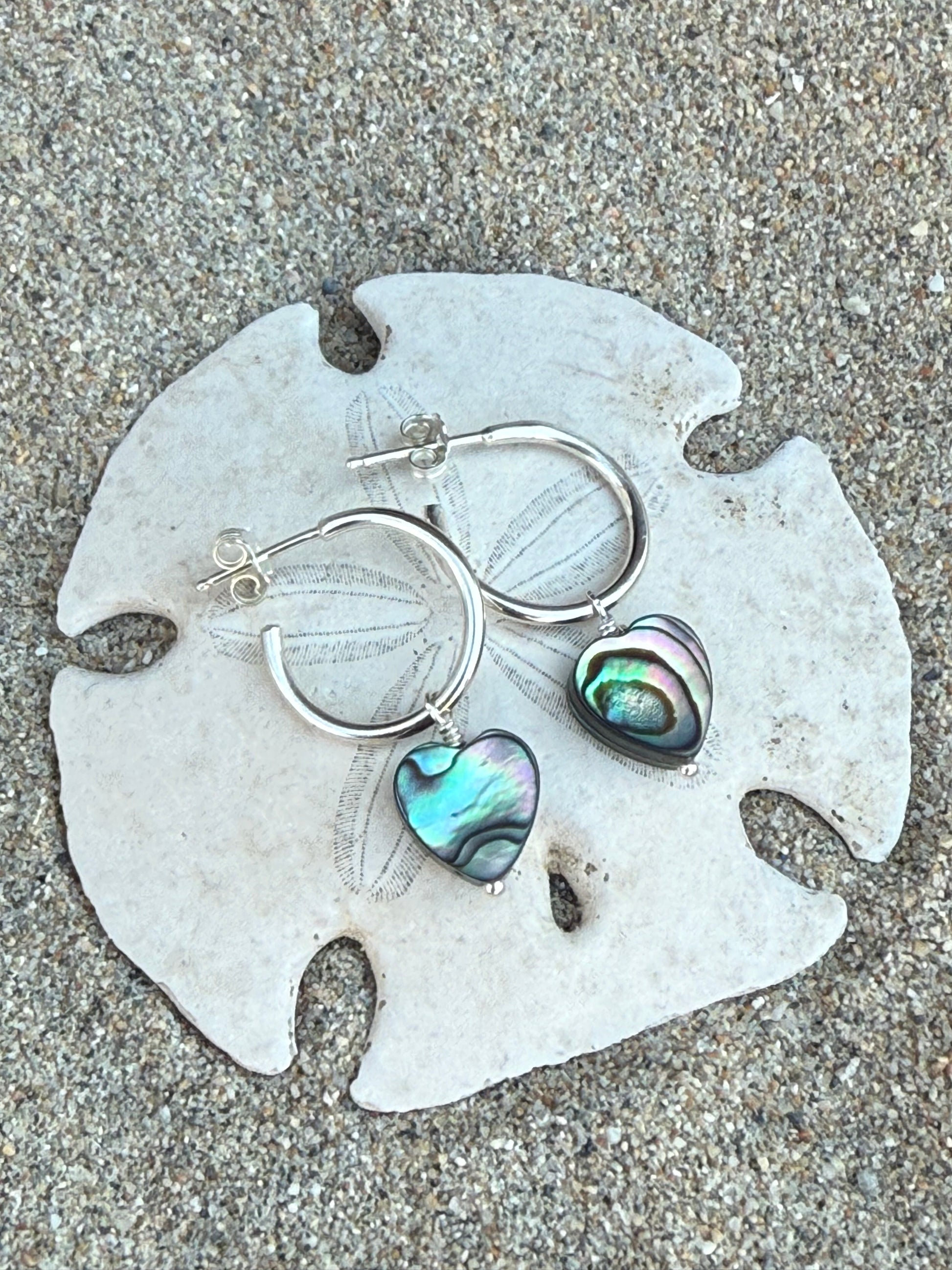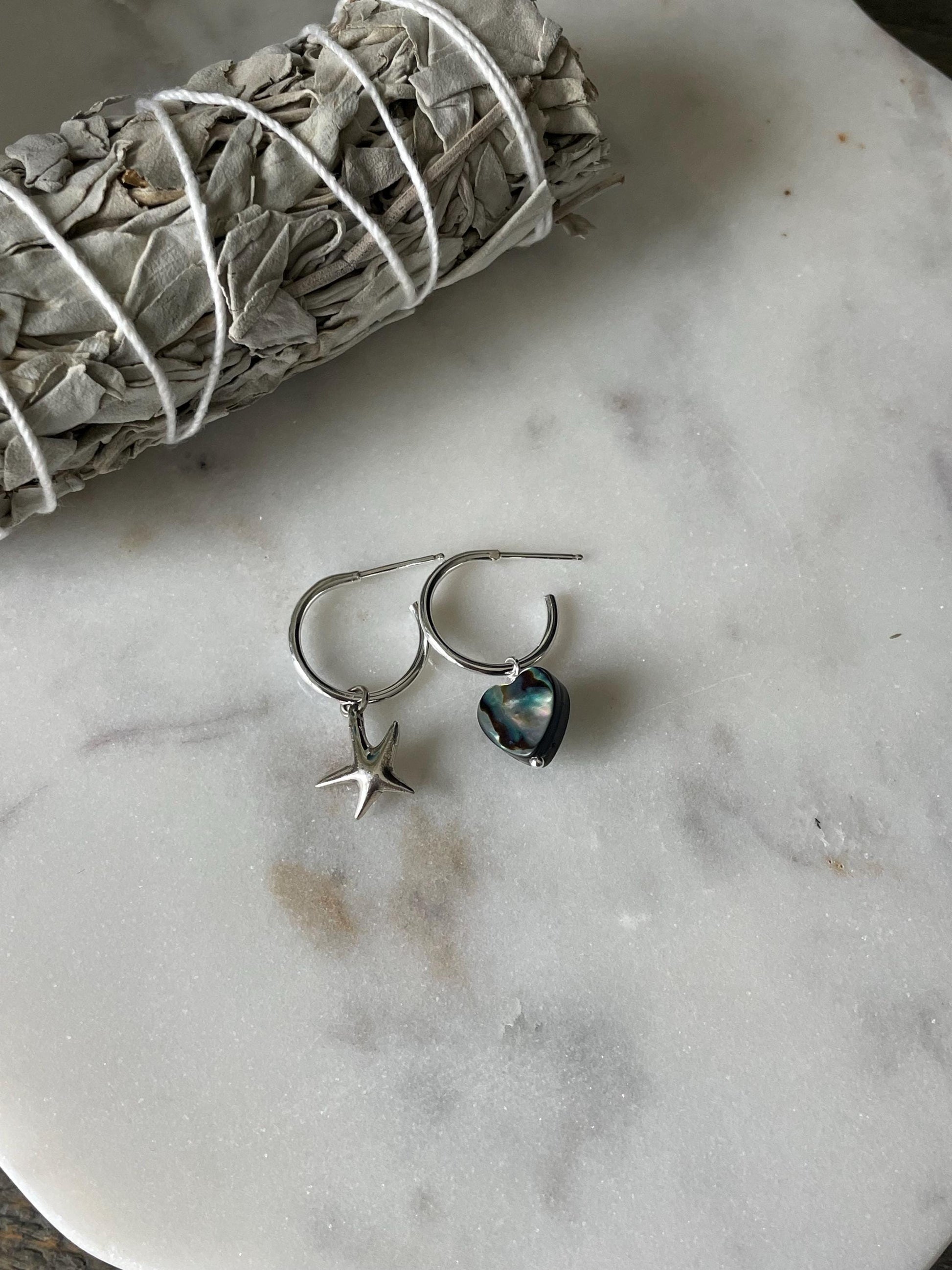 Sterling Silver Hoop Earrings w/Silver Starfish or Heart Abalone Charms